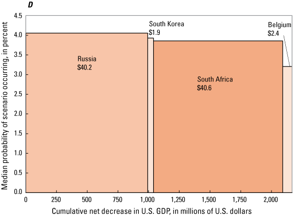 Figure 1D displays the results of the economic impacts model for each scenario (horizontal axis) and the median probability of the scenario occurring (vertical axis) based on the analysis conducted by Ryter and Nassar (2025). In this variable-width column graph, the area of each scenario (the product of the median probability and the net decrease in U.S. GDP) represents the probability-weighted net decrease in U.S. GDP. Although the South African scenario resulted in the largest decrease of U.S. GDP (as also displayed in figure 1C), its probability of occurrence (approximately 3.9 percent) was slightly lower than of the Russian scenario (approximately 4.1 percent). The probability of Russia restricting palladium supplies might seem low given recent geopolitical tensions but is attributable to the relative infrequency with which Russia imposes export restrictions on mineral commodities, which may be a reflection of their importance as a revenue source (Ryter and Nassar, 2025). Additionally, the scenarios do not account for any current or potential U.S.-imposed import sanctions. Nevertheless, the contribution of the Russian scenario (the product of the scenario’s impact and probability represented by the area of the scenario) to the overall probability-weighted net decrease in U.S. GDP was slightly smaller ($40.2 million) than that of the South African scenario ($40.6 million). The contributions to the probability-weighted net decrease in U.S. GDP from the South Korean and Belgian scenarios were both lower. Although the other 5 scenarios are displayed in figure 1D, they are too small (on the horizontal axis) to be legible. The probability-weighted net decrease in U.S. GDP across all scenarios, the entirety of the shaded area of figure 1D, totaled approximately $85 million.