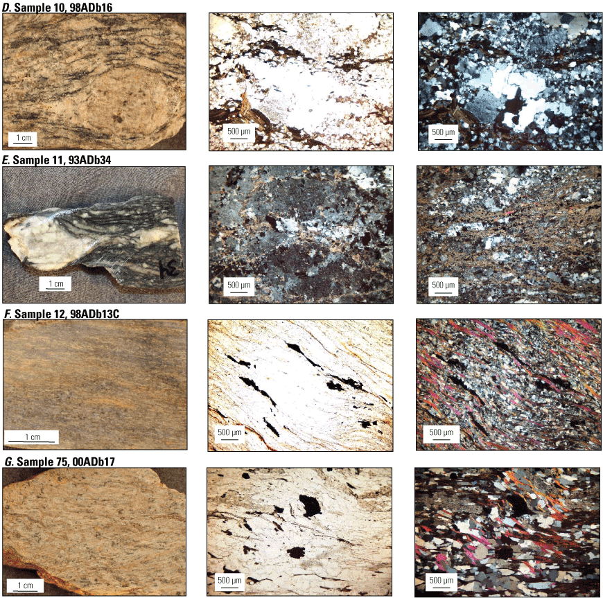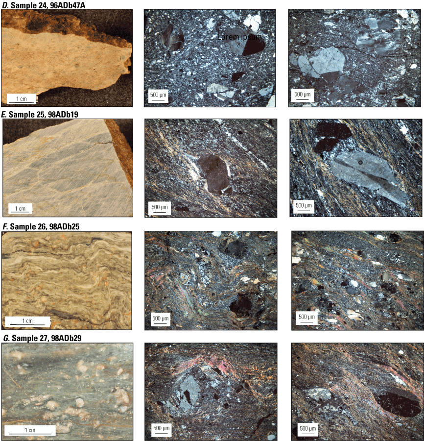 Representative photographs and photomicrographs of selected metaigneous rocks from the Nasina assemblage in east-central Alaska and western Yukon analyzed for U-Pb zircon geochronology and whole-rock geochemistry. Sample numbers and field numbers are given. For each sample, the left column shows a photograph of the cut face of the hand sample (duplicate field numbers indicate different samples from same locality were collected for dating and whole-rock geochemistry) and the middle and right columns show transmitted, cross-polarized-light photomicrographs of a thin section cut from the hand sample. A, Sample 14 is a felsic metatuff showing foliation defined by thin, elongated concentrations of gray quartz and white feldspar. Photomicrographs show very fine-grained annealed quartz and wisps of white mica. Cryptic evidence of relict feldspar phenocrysts are gray, iron-stained patches (center of right image). B, Sample 15 is a felsic metaporphyry showing orange, iron-stained feldspar and white quartz phenocrysts around which a quartz-mica protomylonitic fabric is deflected. Photomicrographs show the fine-grained recrystallized matrix of quartz and white mica. In the middle image, a white quartz phenocryst reveals evidence of former melt inclusions by its irregular outline; the black area at the bottom of the photomicrograph is part of a twinned feldspar. In the right image, the oval-shaped, polygonized quartz porphyroblast in the upper right and the strained (wavy and striped) dark and light gray quartz porphyroblast at the center bottom may have originally been phenocrysts and are evidence of mylonitization. C, Sample 23 is a metarhyolite showing elongate patches of white and light gray minerals identified as probable feldspar and quartz, respectively. Photomicrographs show fine-grained matrix of quartz and feldspar and likely former phenocrysts replaced by finely crystalline quartz, feldspar, and sericite. D, Sample 24 is a metarhyolite showing weakly developed foliation and light gray quartz and white feldspar phenocrysts. Photomicrographs show fine-grained recrystallized matrix of quartz and feldspar and twinned, gray feldspar phenocrysts and white to gray, strained quartz phenocrysts. E, Sample 25 is a metarhyolite showing well-developed foliation. Photomicrographs show fine-grained recrystallized matrix of quartz and sericite enveloping a quartz phenocryst (middle image) and a twinned feldspar (left image). F, Sample 26 is a metarhyolite showing wavy crenulation cleavage formed by thin folia of white quartz, rounded augen of white quartz, and orange iron-stained feldspar. Photomicrographs show fine-grained recrystallized matrix of quartz and sericite folia enveloping mostly white to light gray quartz phenocrysts and dark gray to black feldspar phenocrysts. G, Sample 27 is a metarhyolite showing rotated and rounded white feldspar phenocrysts in a greenish and white fine-grained matrix. Photomicrographs show mylonitic texture with foliation defined by pinkish to bluish sericite and cryptocrystalline quartz that wraps around mylonitized phenocrysts that have cores of relict potassium-feldspar phenocrysts (light gray mineral in left-central part of middle image) and partially replaced margins of microcrystalline quartz. Right image shows an oval polygonized quartz grain (lower left) and a rotated, twinned potassium-feldspar phenocryst (lower right). cm, centimeter; µm, micrometer; mm, millimeter.