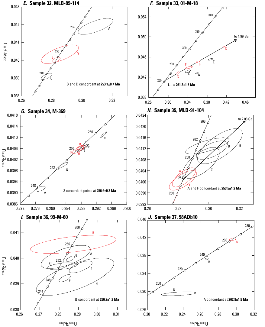 Crystallization ages for each sample are assigned based on a weighted average of the 206Pb/238U ages of multiple analyses (fig. 10 of main text) and are shown in table 2 and on figure 4 of the main text.
