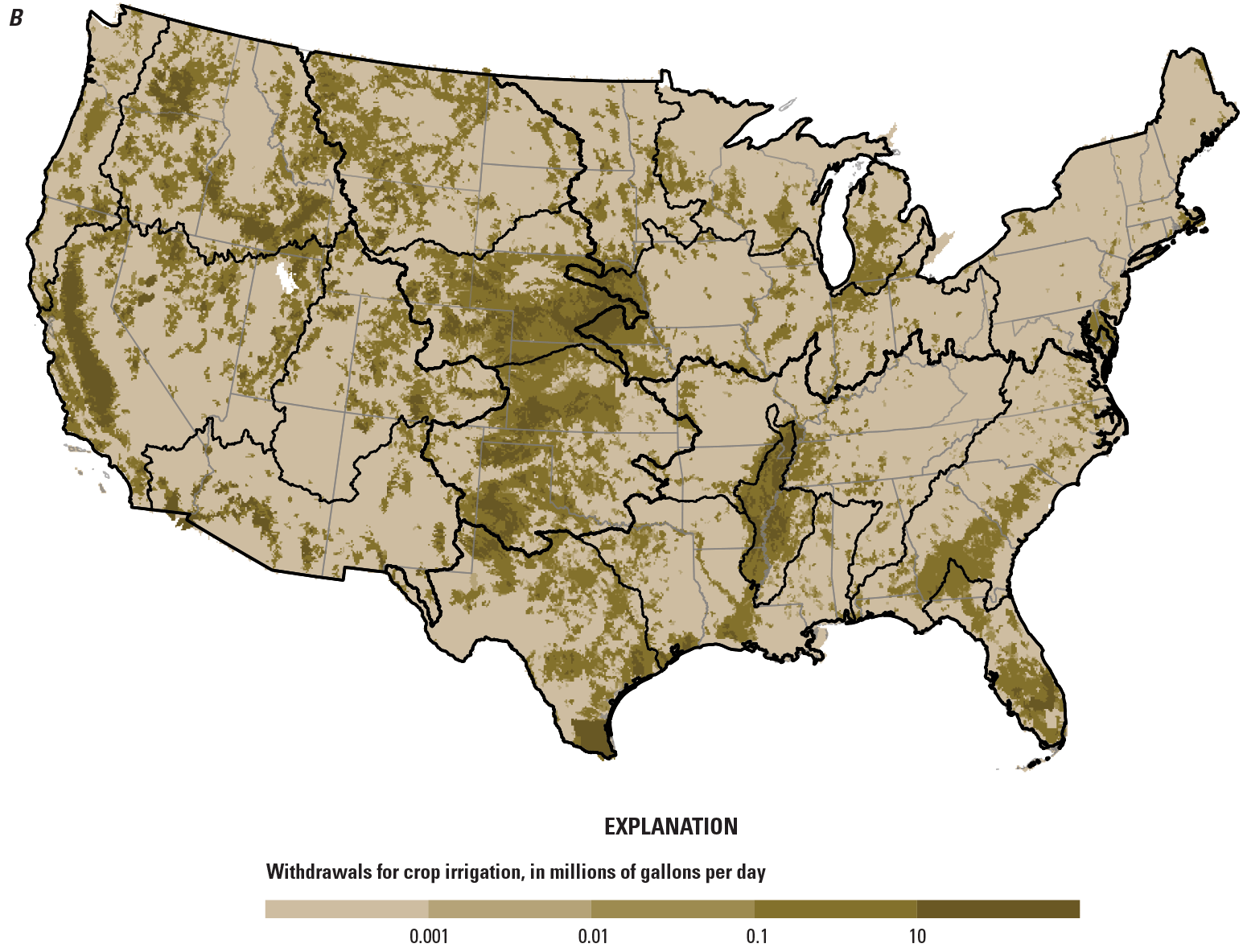 Total estimated withdrawals for crop irrigation, thermoelectric power, and public supply are greater than 20,000 Mgal/d in California and Texas, and are 13,000 in Nebraska, with the largest part of the withdrawal for each of these States being for crop irrigation (fig. 3A). Because consumptive use is a relatively large percentage of the withdrawal for crop-irrigation water use (Martin and others, 2023; Haynes and others, 2024), places where crop-irrigation water use is dominant (western States of Oregon through Kansas in fig. 3A) have large consumptive use losses. Implications for water availability are related to the absolute volume of the withdrawal (immediate removal from the local water resource), the volume of withdrawal lost to consumptive use (sustained removal from the local water resource), and the place of use relative to the withdrawal. The latter point refers to water being moved away from the place of withdrawal in constructed conveyances; if the movement crosses a hydrologic boundary, it is referred to as an interbasin transfer (see section, “Interbasin Transfers”).