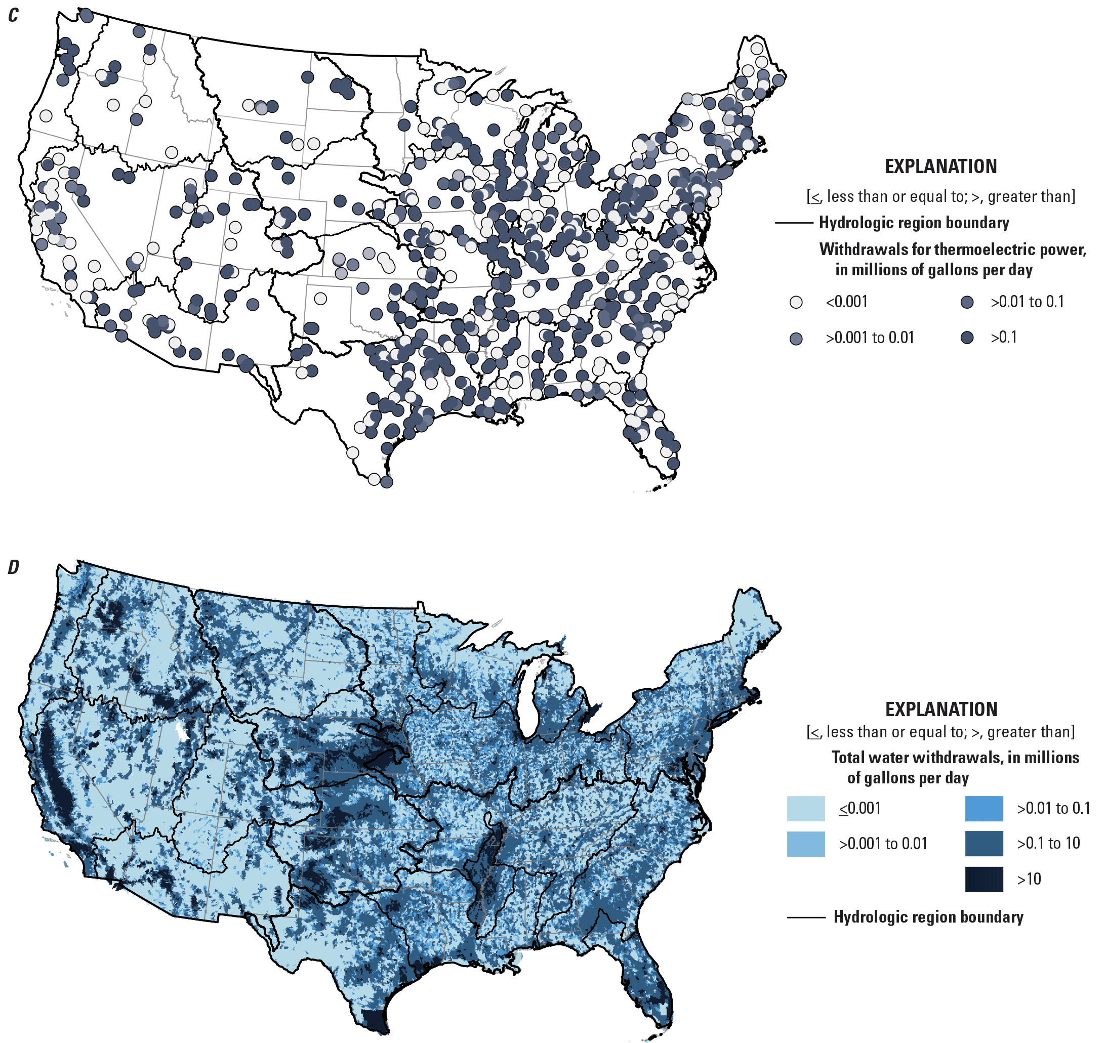 Model estimates showing mean annual water withdrawals for (A) public supply, (B) crop irrigation, (C) thermoelectric-power use, and (D) sum of all three categories, across the conterminous United States (CONUS) by hydrologic regions (indicated by internal black lines) and 12-digit hydrologic unit codes (HUC12s), during water year 2020. Scales are not the same for all maps. Thermoelectric-power water withdrawals include freshwater and saline water. Thermoelectric-power water use map shows symbols for HUC12 centroids because the HUC12s with thermoelectric powerplants are too small to be visible at the CONUS scale. Model estimates for public supply, crop irrigation, and thermoelectric-power water withdrawals are from Luukkonen and others (2023), Haynes and others (2024), and Galanter and others (2023), respectively.