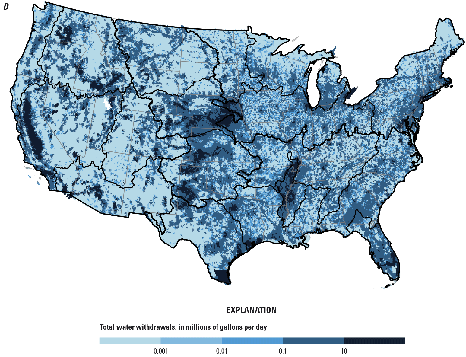 This chapter offers the first comprehensive analysis for public supply, crop irrigation, and thermoelectric-power water use for the conterminous United States (CONUS) using modeling approaches that provide nearly continuous information at temporal and spatial scales suitable for integration into national water-availability models. We examine water use for water years 2010–20 at varying scales—CONUS, State, and the following three watershed scales: (1) HUC12 (12-digit hydrologic unit code—small watersheds sized 50–100 square kilometers); (2) hydrologic region (grouped basins that represent major factors influencing the hydrologic cycle; Van Metre and others 2020); and (3) aggregated hydrologic regions (hydrologic regions grouped into four large areas that cover the CONUS (chap. F, Stets and others, 2025b). Previous U.S. Geological Survey (USGS) estimates of water use (for example, Dieter and others, 2018a) were provided at the scale of county and State; some earlier estimates (for example, Solley and others, 1998) were at the scale of Water-Resources Council regions (21 natural drainage basins designated for the CONUS, Alaska, Hawaii, and the Caribbean [Water Resources Council, 1968]; sidebar 1). Water-use summaries at various spatial scales provide a context for understanding water demand, discussing factors influencing water use, and evaluating current and potential future water-use challenges considering water availability. Newly available output from three water-use models for the categories of public supply, crop irrigation, and thermoelectric power, is presented and discussed in this chapter (Galanter and others, 2023; Luukkonen and others, 2023; Martin and others, 2023; Haynes and others, 2024). We used published estimates from the most recent national assessment in 2015 for the remaining five categories of water use (industrial, self-supplied domestic, mining, livestock, and aquaculture) that are typically estimated and reported by the USGS and that constitute about 10 percent of total withdrawals in the United States.