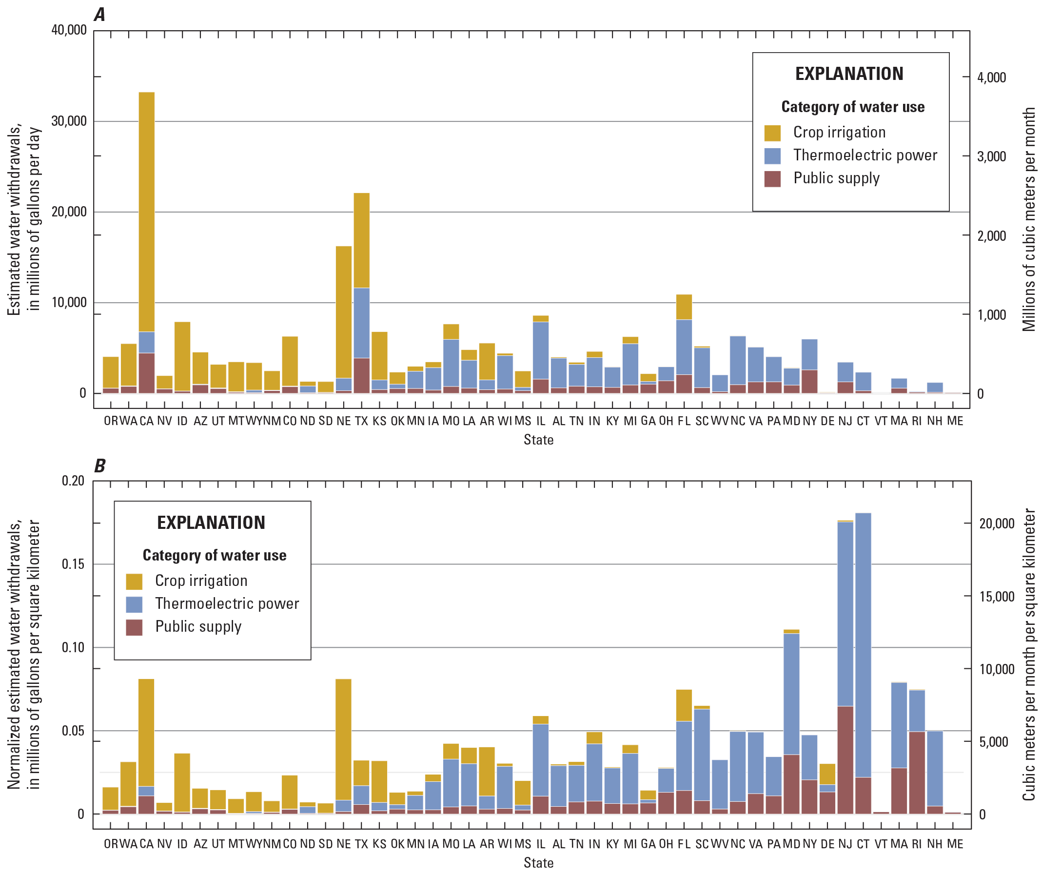 Model estimates of crop-irrigation, thermoelectric-power, and public-supply water withdrawals by State from west to east in the conterminous United States, for water year 2020. Data are shown as (A) not normalized and (B) normalized by area of State. Thermoelectric power water withdrawals include freshwater and saline water. Values for States (which are indicated with 2-digit postal codes) were generated by apportioning 12-digit hydrologic unit code (HUC12) results to States by area. Water withdrawals for some states (Delaware, Vermont, Rhode Island, Maine) are not zero but are too small to appear in the figure. Model estimates for public supply, crop irrigation, and thermoelectric-power water withdrawals are from Galanter and others (2023), Luukkonen and others (2023), and Haynes and others (2024), respectively.