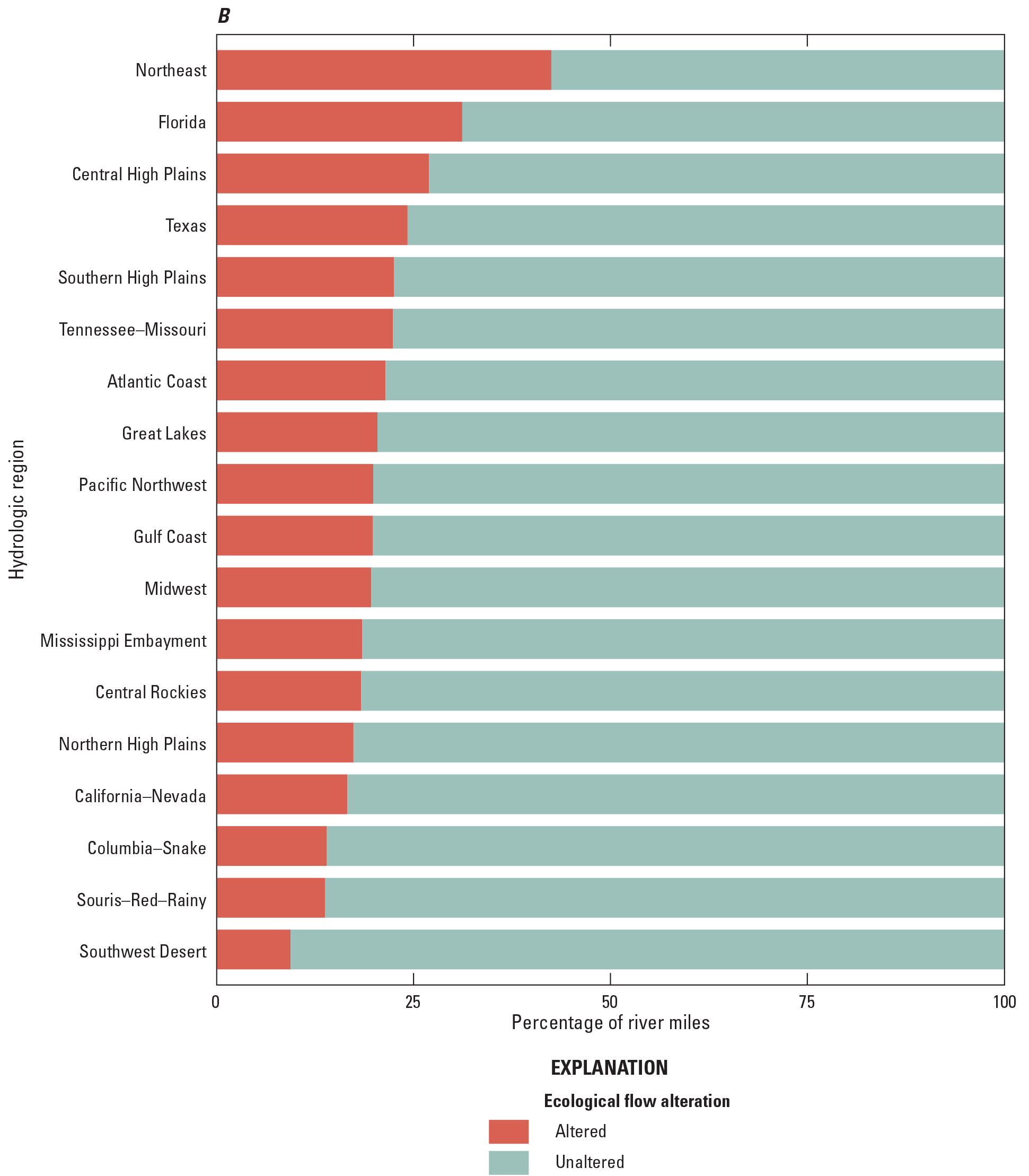 (A) Ecological water availability for the conterminous United States, represented by predictions of altered flow regime metrics—low and high flow magnitude, duration, and variability—determined to be regionally relevant to ecological conditions by Carlisle and others (2019). “Unaltered” does not indicate that there is no predicted hydrologic alteration in that area but that there were no flow attributes that were altered and determined to be related to regional ecological condition. (B) Percentage of all river miles within each hydrologic region of the conterminous United States with ecologically relevant flow alteration. White areas within the map were excluded from analysis.