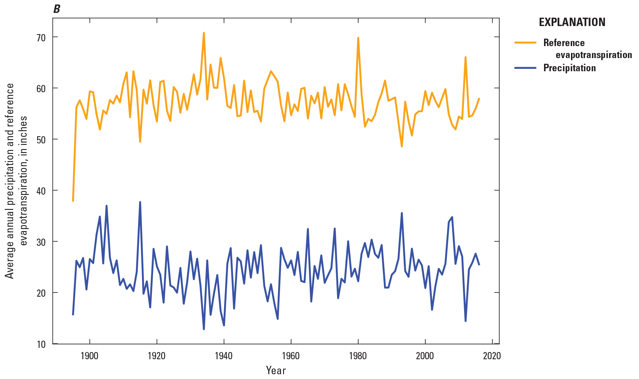 Crop coefficients (Kc), which are properties ascribed to plants and used to estimate AET, vary depending on land use or crop type. Allen and others (1998) reported Kc values for the two most common land uses, rangeland and corn, that vary from 0.15 to 1.05 and 0.15 to 1.20 for different parts of the growing season cycle. Crops typically are irrigated between May and September each year based on planting dates and harvesting dates from the U.S. Department of Agriculture (1997 and 2016). Further, the largest amounts of irrigation typically occur in July and August when there is the most difference between ETref and precipitation. The fraction of AET that comes from plant transpiration also varies across a single year, much like Kc values. For example, AET during the nongrowing season is predominantly from the evaporation because plants are absent or dormant. Alternately, AET is predominantly transpiration during the middle of the growing season when leaf area index is largest, and more plant surface area is available to transpire.