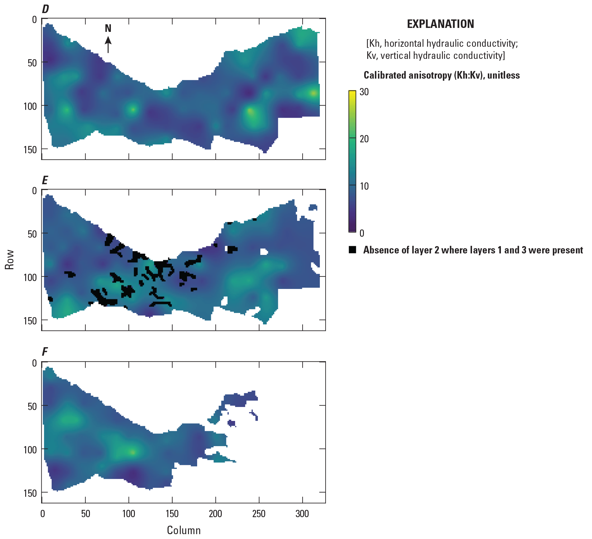 Aquifer properties, particularly horizontal hydraulic conductivity (Kh) and specific yield (Sy) have been evaluated in previous studies. Houston and others (2013) estimated Kh and Sy at test holes in the Northern High Plains aquifer, using lithologic logs to interpret Kh and Sy for vertical intervals of the aquifer. Peterson (2009) included the calibrated Kh for HUs 1 through 6; HUs 1 and 2 had Kh values of about 10 and 155 ft/d, respectively (table 1; table 3 in Peterson, 2009). The intervals representing HUs 3 and 4 consisted of predominantly silt. These two HUs had similar Kh of about 8 ft/d and acted as a semiconfining unit for most of the study area (Peterson, 2009). The average Kh for the interval representing HUs 5 and 6 was about 33 and 10 ft/d, respectively (Peterson, 2009).