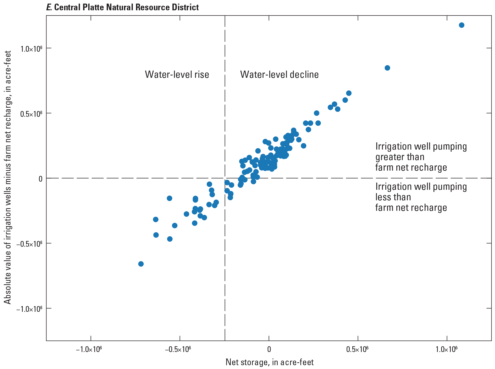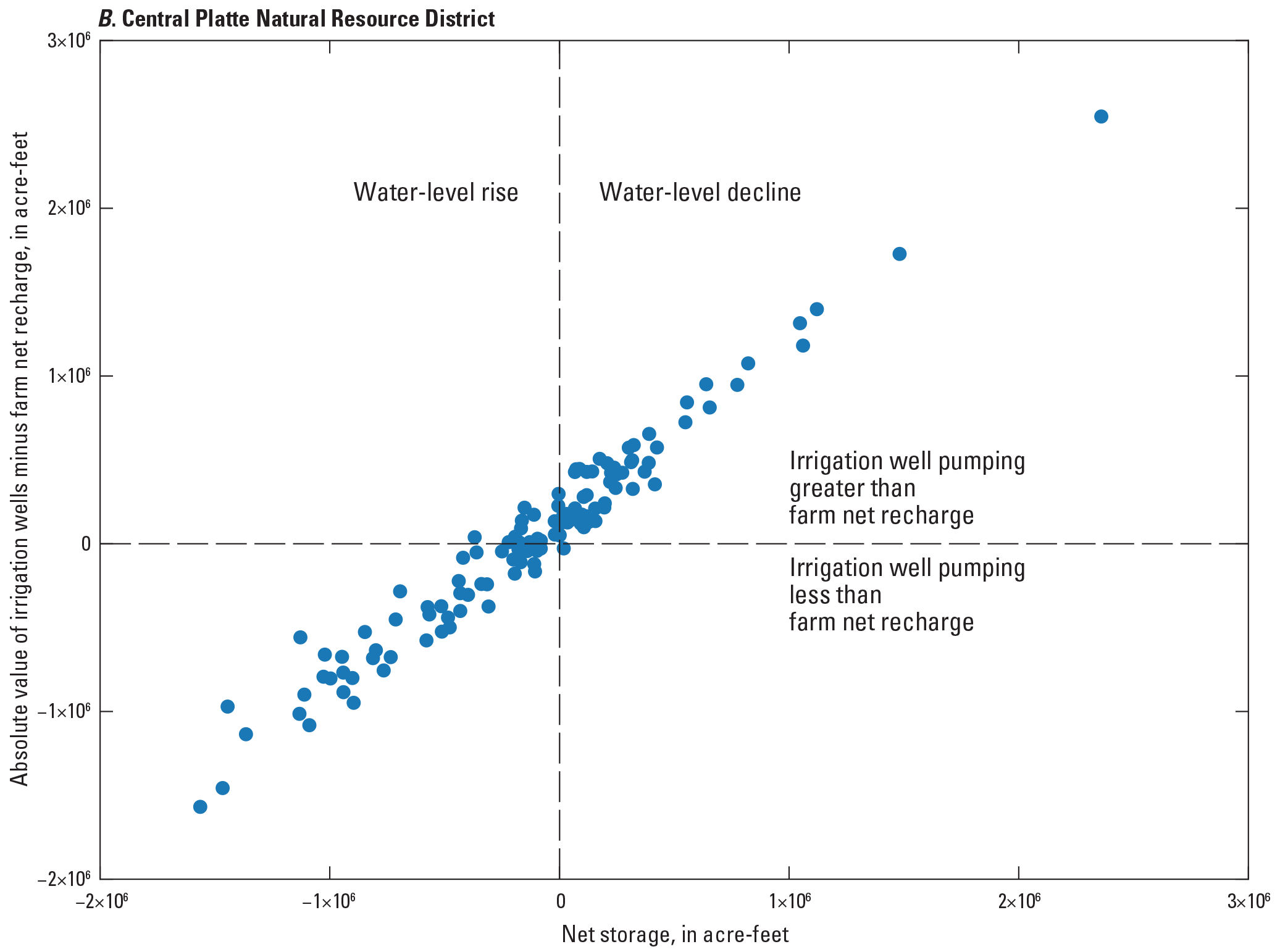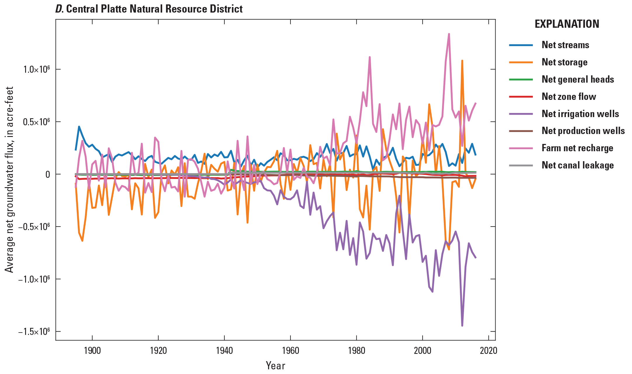 The Central Platte Natural Resources District (CPNRD; fig. 1A) is 1 of 23 Natural Resources Districts (NRDs) throughout Nebraska created by Nebraska Legislature (Nebraska Legislature, 1969) in 1969 with the goal of protecting its natural resources (Nebraska Association of Resources Districts, 2020). The NRDs are responsible for regulating groundwater use (University of Nebraska-Lincoln, 2020); the Nebraska Department of Natural Resources regulates surface-water use. The groundwater and surface-water supply of the CPNRD is one of its most valuable natural resources. Current beneficial water uses within the CPNRD include domestic and industrial water supply for a population of about 112,000; irrigation water supply for about 1 million acres; and minimum annual flows of more than 1 million acre-feet (acre-ft) of water in the Platte River for recreational and wildlife habitat use. The groundwater and surface-water supply supports an agricultural economy that generates more than $2 billion per year (U.S. Department of Agriculture, 2019). The CPNRD’s main groundwater management goal is “to assure an adequate supply of water for feasible and beneficial uses through proper management, conservation, development and utilization of the District’s water resources” (Central Platte Natural Resources District, 2019, p. 1).