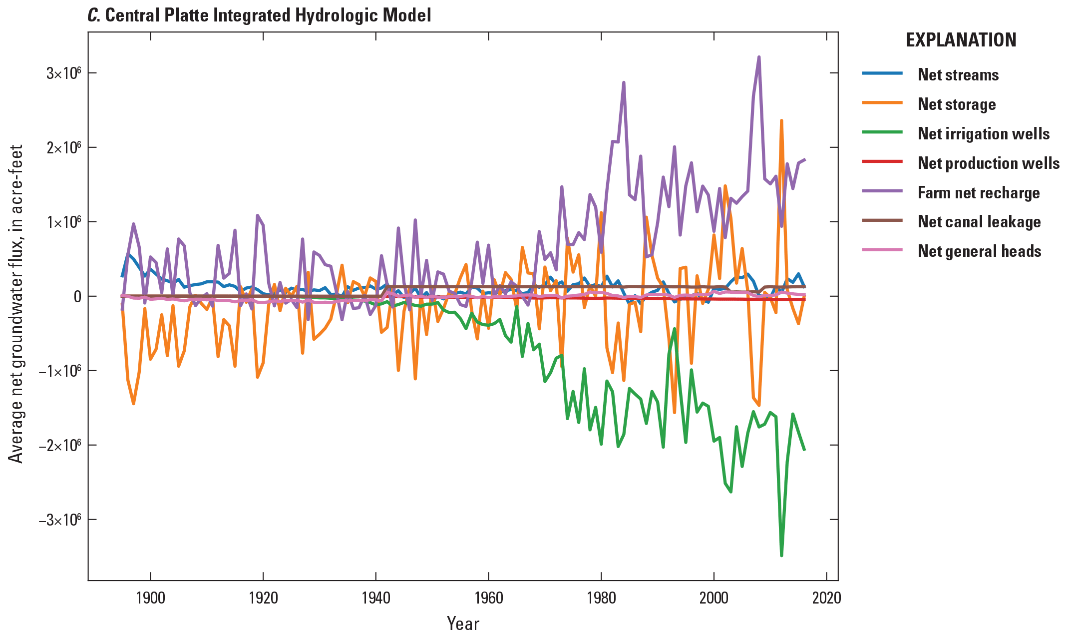 An integrated hydrologic model, called the Central Platte Integrated Hydrologic Model, was constructed using the MODFLOW-One-Water Hydrologic Model code with the Newton solver. This code integrates climate, landscape, surface water, and groundwater-flow processes in a fully coupled approach. Model framework included 163 rows; 327 columns; 2,640 feet cell sides; and 3 vertical layers. A predevelopment model simulated steady-state hydrologic conditions prior to April 30, 1895, and a development period model discretized into 610 stress periods simulated transient hydrologic conditions from May 1, 1895, to December 31, 2016, using 170 biannual stress periods from 1895 to 1980, and monthly stress periods from May 1, 1980, to December 31, 2016.