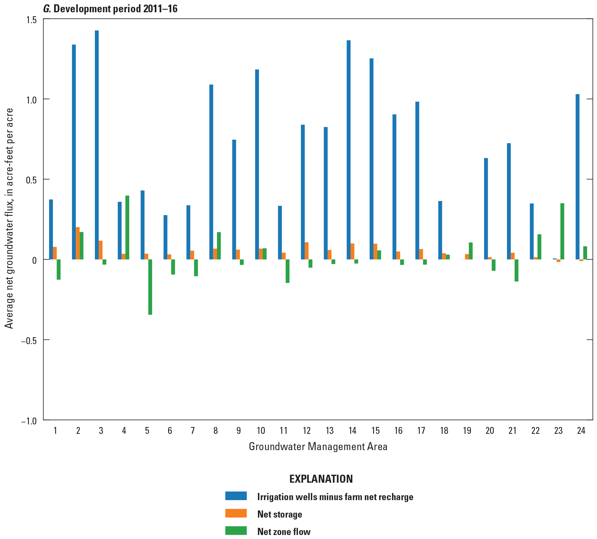 | 2011–16 | 4,926,071 | −1,990,000 | −1,990,000 to −2,190,000 | Irrigated acres in 2011–16 multiplied by average irrigation depth of 10 inches per year based on difference between growing season precipitation and irrigated corn AET. The range was based on efficiency between 80 and 90 percent (Peterson, 2009; Irmak and others, 2011). |