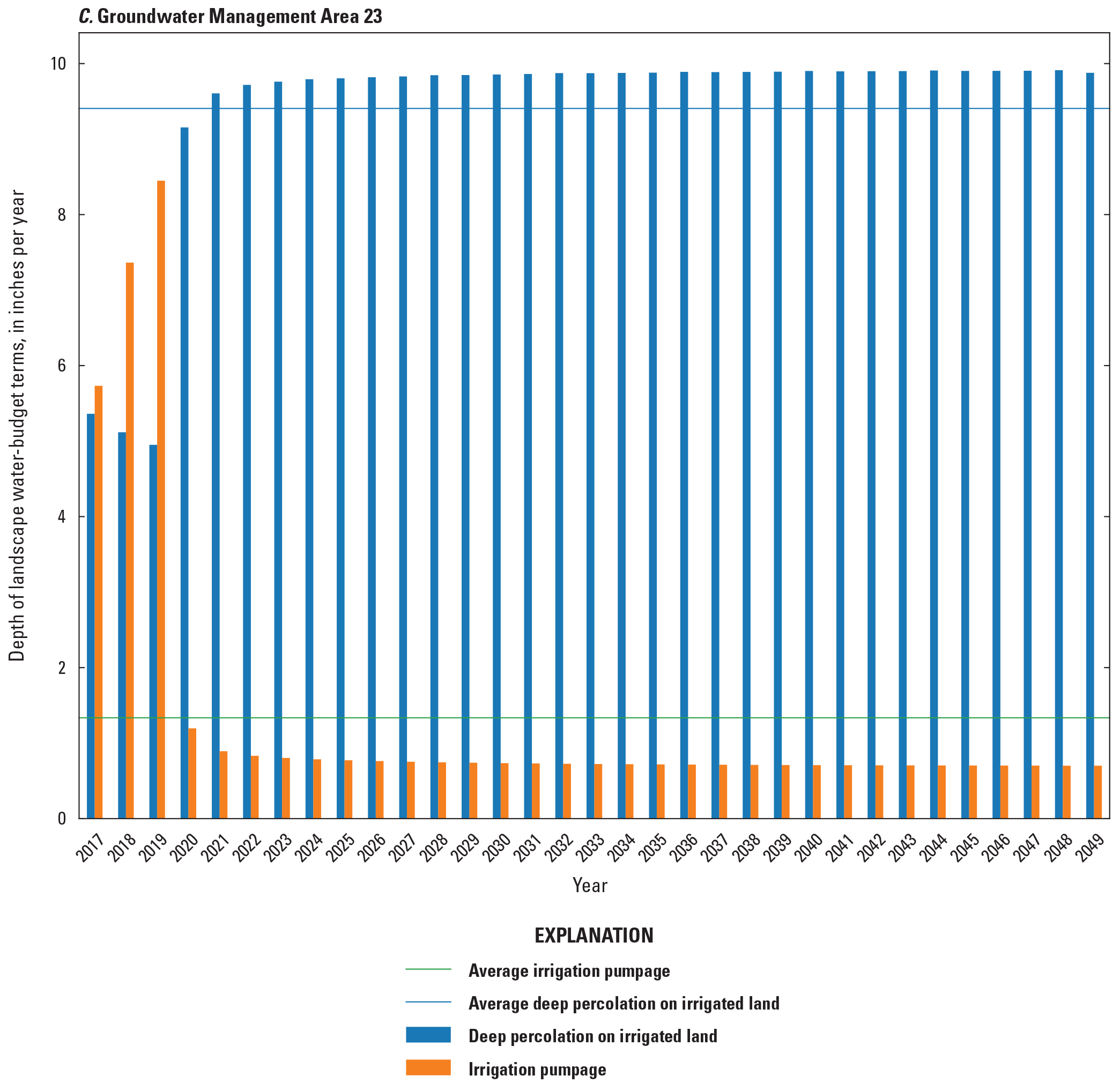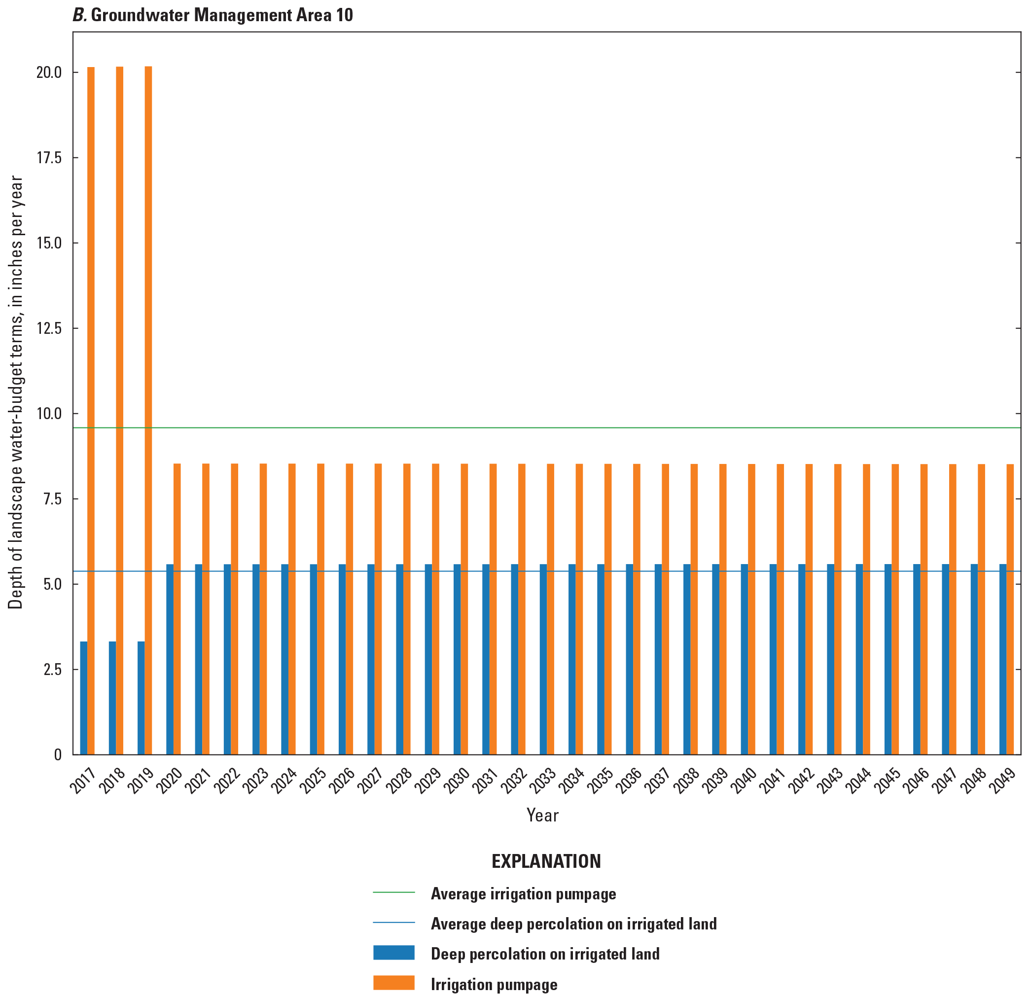 Deep percolation past the root zone (often referred to as recharge) in the study area has been estimated at 0.2 to 2.1 in/yr below rangeland (that is, pasture), 2.7 to 6.3 in/yr below groundwater-irrigated cropland, 10 in/yr below surface-water irrigated cropland, and 0.5 to 2.5 in/yr below dry cropland (Steele and others, 2014). Additionally, recharge in the study area that occurs as leakage from the unlined irrigation canals can exceed 10 in/yr (Peterson and others, 2016). The highest recharge rates in areas without canal influence were about 4 to 6 in/yr in the flat, densely groundwater-irrigated cropland in the Platte River valley (Peterson and others, 2016).