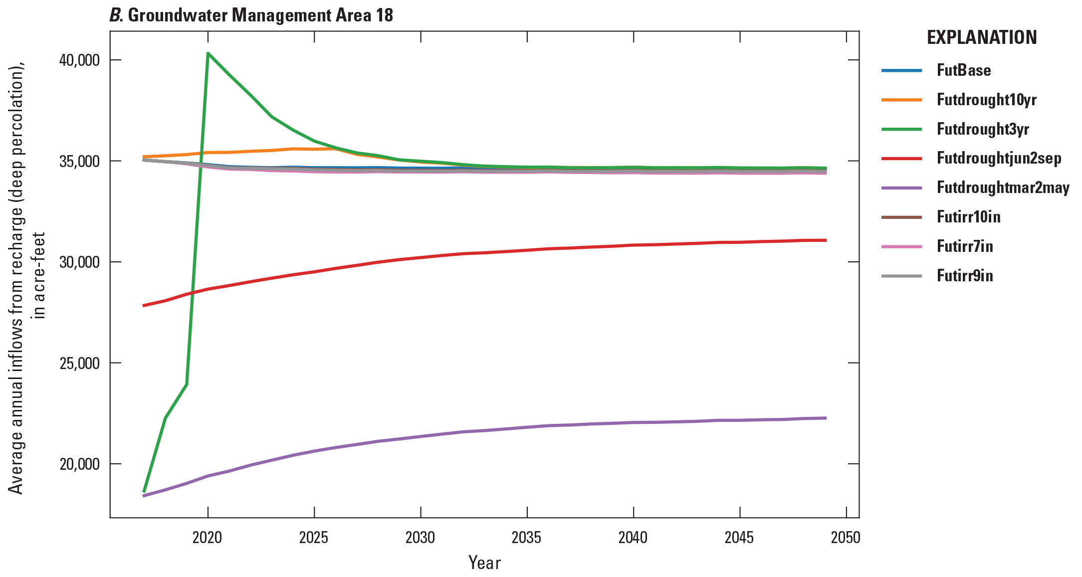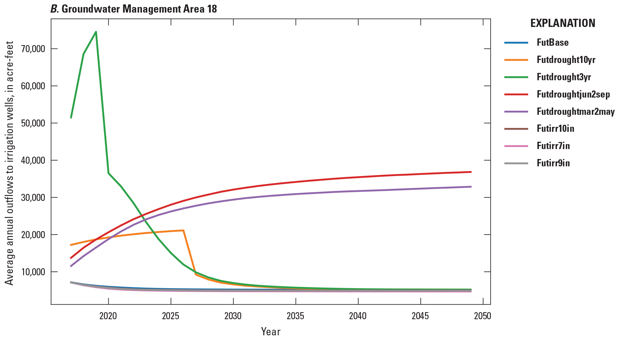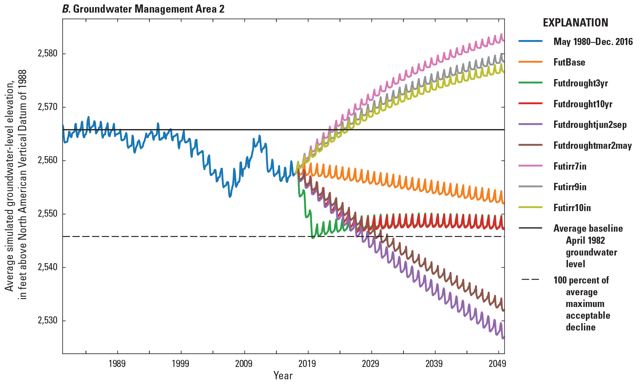The calibrated Central Platte Integrated Hydrologic Model was used to simulate eight different potential future climate and irrigation pumping conditions from January 1, 2017, to December 31, 2049. Simulated future groundwater levels within the Central Platte Natural Resources District varied significantly between scenarios and locally, from 13.8 feet below to 7.6 feet above baseline 1982 groundwater levels. Most areas exhibited groundwater-level declines for the drought scenarios and rises for the alternate irrigation scenarios. Changes in scenario groundwater levels correlated with the relations between farm net recharge and irrigation pumping. Linear “first order second moment” techniques indicated that the uncertainty in projected groundwater altitudes was reduced by 15.33 feet through model calibration.
