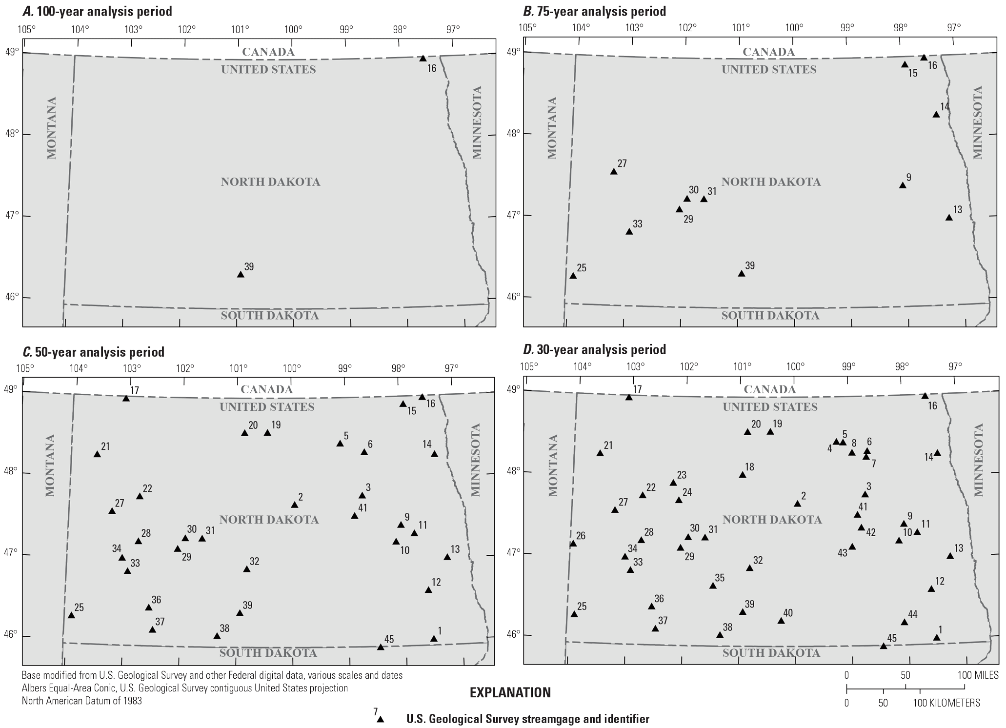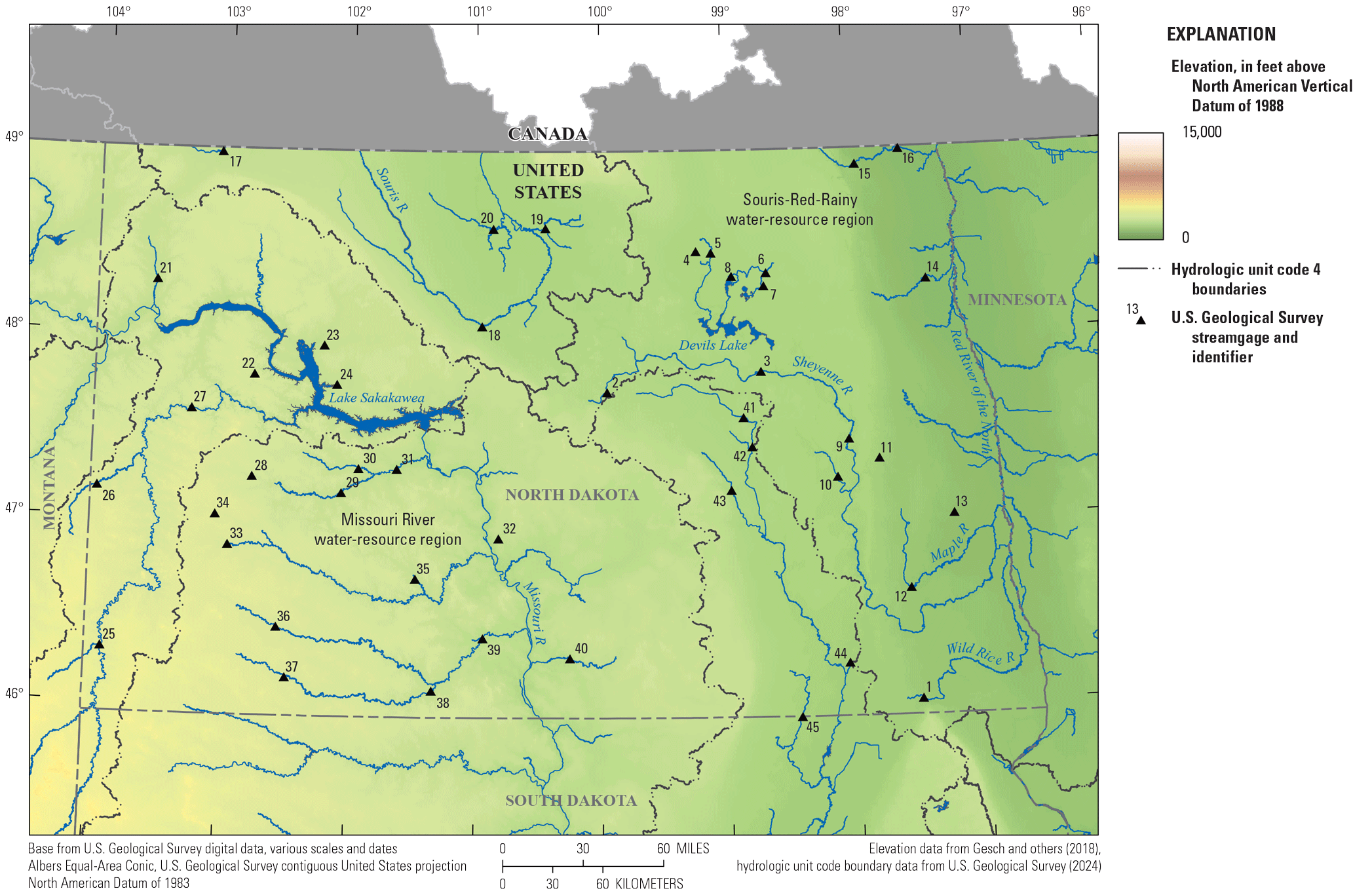 North Dakota lies in the center of North America (U.S. Geological Survey, undated b), and the topography is generally low relief (fig. 1). North Dakota is separated into two major drainage basins. The streamgages labeled 1–20 represent streams draining to Hudson Bay, Canada (not shown), and are part of the Souris-Red-Rainy water-resource region. The remainder of the labeled streamgages represent streams draining to the Gulf of America (not shown) and are part of the Missouri water-resource region (Seaber and others, 1987).