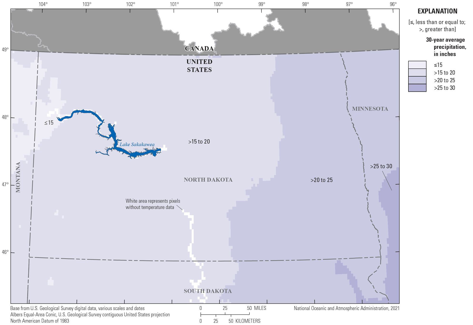 Map showing the average annual precipitation in North Dakota for the 30-year period, 1991—2020 (National Oceanic and Atmospheric Administration, 2021).