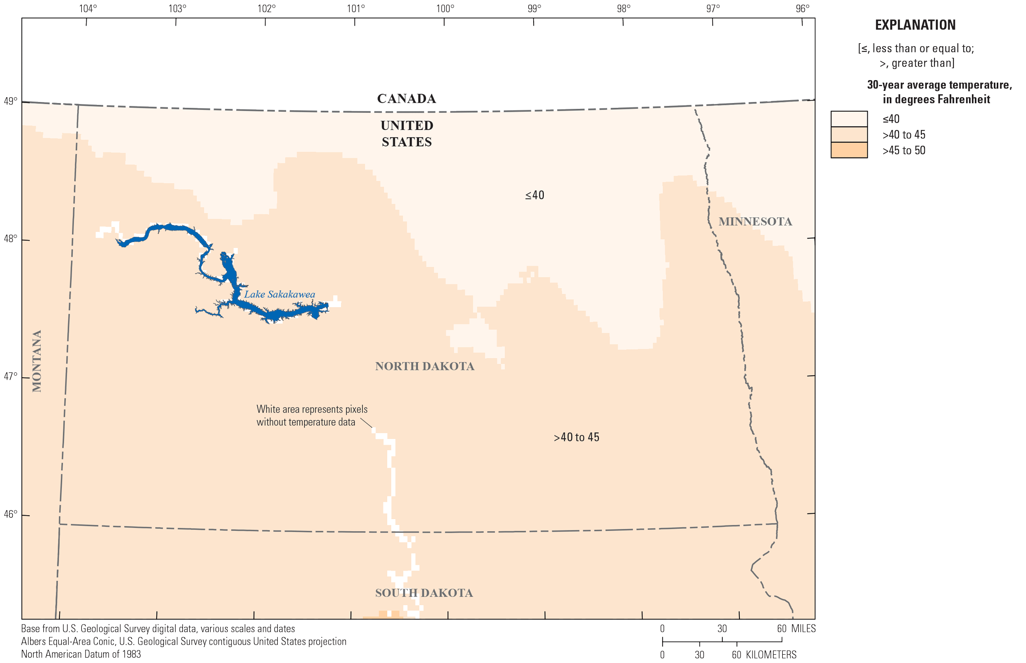 North Dakota is far from the temperature moderating effects of the oceans and as a result has one of the most variable temperature regimes in the United States (Frankson and others, 2022). Average (1991–2020) January temperatures range from 4 degrees Fahrenheit (°F) in the northeast to 18 °F in the southwest; average July temperatures range from 65 °F in the northeast to 72 °F in the south, and extreme temperatures of 100 °F are most prevalent in the southwestern and south-central areas (Frankson and others, 2022). Average annual temperature over the 30-year period of 1991 through 2020 is shown in figure 3.