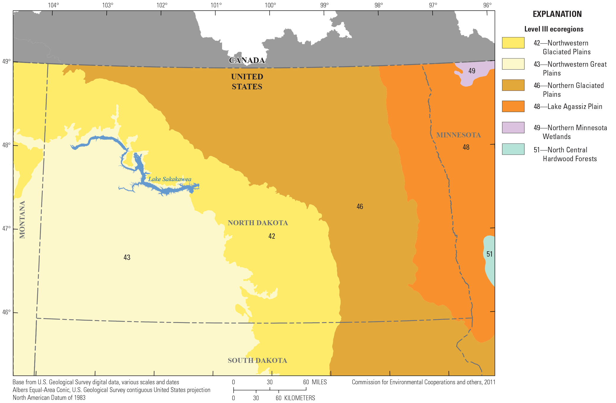 The Northwestern Great Plains, with some small areas of exception, lie in southwestern North Dakota (fig. 5). This area encompasses the Missouri Plateau and is semiarid with rolling plains and buttes and badlands (U.S. Environmental Protection Agency, 2013). Land use includes farming and cattle ranching; rain is a limiting factor in agriculture productivity (U.S. Environmental Protection Agency, 2013; Bryce and others, undated).