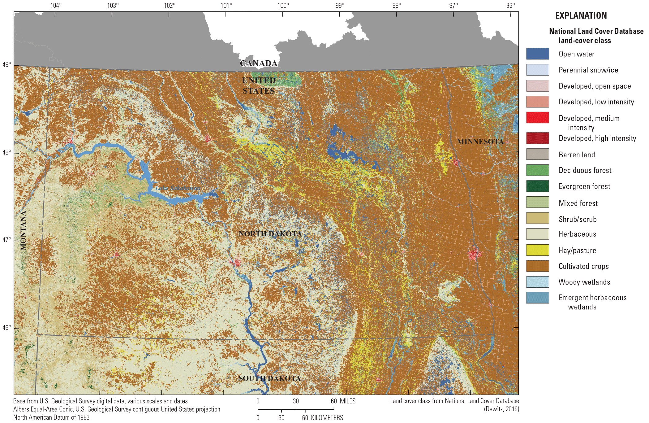 Map showing the land-cover classes of North Dakota (Dewitz, 2019).