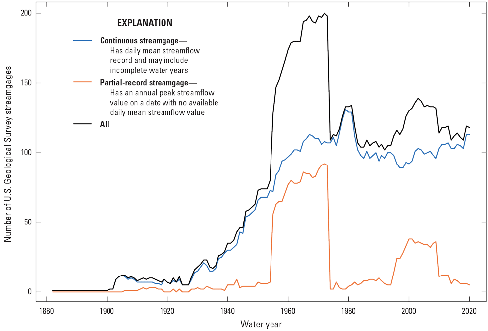 The streamgages represented in figure 7 and used in this study represent continuous and partial-record gages. Streamgages identified as continuous have daily mean streamflow record and may include incomplete water years (the period from October 1 to September 30 designated by the year in which it ends). Streamgages identified as partial record have a peak-flow value on a date with no available daily mean streamflow value. Partial-record streamgages can be streamgages that are operated seasonally, such as sites that have little to no flow in the winter where the entire channel may freeze. Other partial-record streamgages can be crest-stage gages, which are low-cost devices used to estimate flood crests, and then indirect methods are used to estimate the peak flow (Rantz, 1982; U.S. Geological Survey, undated a). The crest-stage gages represent much of the increase in streamgages in North Dakota from the late 1950s to late 1970s.