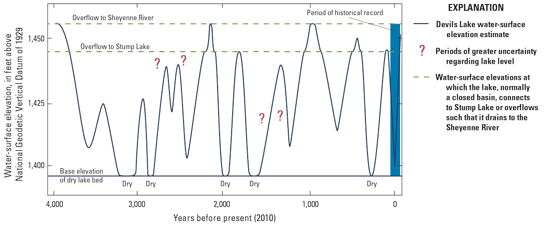 Wet and dry periods are visible in the sediments of Devils Lake (fig. 1), North Dakota, for the past 4,000 years (Bluemle, 1996), in tree rings and sediment cores in a 1,000-year reconstruction at the Waubay Lakes complex in northeastern South Dakota (not shown; Shapley and others, 2005), and in tree rings in the region for the past 300 years (Ryberg and others, 2016b). For most of North Dakota’s history, Devils Lake has been a closed basin (artificial outlets were completed in 2005 and 2012; North Dakota Department of Water Resources, 2024). However, Devils Lake has overflowed into Stump Lake and then through Tolna Coulee (not shown) and into the Sheyenne and Red Rivers (fig. 1) at least twice during the past 4,000 years. The last Devils Lake spill into the Sheyenne River was within the last 1,800 years (Wiche and others, 2000b). Because of the nature of the closed basin, the rise and fall of Devils Lake represents longer term wetting and drying periods, and a depiction of Devils Lake elevations in the last 4,000 years is shown in figure 8. Variations of figure 8 have been a useful means for depicting hydroclimatic variability in North Dakota for decades. The idea for the figure originated in the University of North Dakota dissertation of Edward Callender (1968; fig. 45, p. 248) and was based on the analysis of sediment cores for the lake. John Bluemle of the North Dakota Geological Survey refined the figure with additional data based on radio-carbon dating of soils (1991, fig. 7, p. 10). The North Dakota Department of Water Resources subsequently updated the figure (North Dakota Department of Water Resources, 2024).