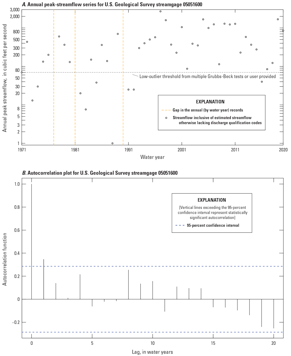 Flood-flow frequency analysis (flood-frequency analysis) is essential to water-resources management applications, including critical structure design (for example, bridges and culverts) and floodplain mapping. Standardized recommended guidelines for completing flood-flow frequency analyses are presented in Bulletin 17C (England and others, 2018). A basic assumption within Bulletin 17C is that, for basins without major hydrologic alterations (for example, regulation, diversion, and urbanization), statistical properties of the distribution of annual peak streamflows (peak flows) are stationary; that is, the mean, variance, and skew of the population from which the peaks are observations are assumed constant. Stationarity requires that all the data represent a consistent hydrologic regime within the same, albeit highly variable, fundamental climatic system. From the onset of the U.S. Geological Survey (USGS) streamgaging program through much of the 20th century, the stationarity assumption was widely accepted within the flood-frequency community. However, in recent decades, better understanding of long-term climatic persistence (periods of clustered floods or droughts, or wet or dry periods compared to median streamflow at a particular site), as well as concerns about potential climate change and land-use change, have caused the stationarity assumption to be reexamined (Milly and others, 2008; Lins and Cohn, 2011; Stedinger and Griffis, 2011; Koutsoyiannis and Montanari, 2015; Serinaldi and Kilsby, 2015).