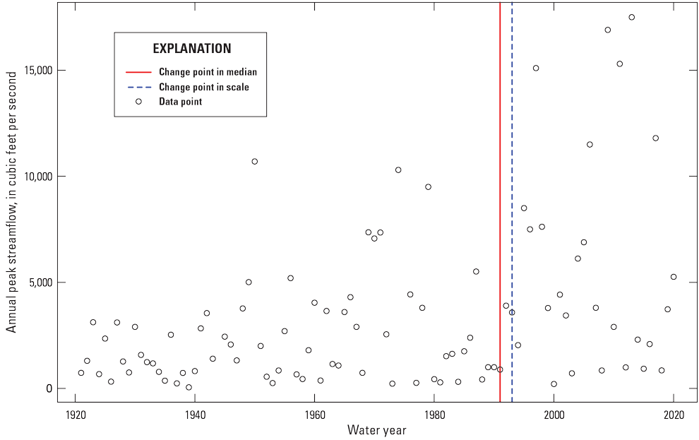 Nonstationarity is a statistical property of a peak-flow series such that the long-term distributional properties (the mean, variance, or skew) change one or more times either gradually or abruptly through time. Individual nonstationarities could be attributed to one driver (for example, either flow regulation, land-use change, or climate) but may be the result of a mixture of drivers (Vogel and others, 2011), making detection and attribution of nonstationarities challenging (Barth and others, 2022; Levin and Holtschlag, 2022; Sando and others, 2022). Nonstationarity in peak flow can manifest as a monotonic trend of gradually increasing or decreasing peak flows over time (Hodgkins and others, 2019) or as an abrupt change in the central tendency (mean or median), variability, or skew of peak flows (Ryberg and others, 2020a). Not incorporating observed trends into flood-frequency analysis can result in a poor representation of the true flood risk. Bulletin 17C does not offer guidance on how to incorporate nonstationarities when estimating floods and further identifies a need for additional flood-frequency studies that incorporate changing climate or basin characteristics into the analysis (England and others, 2018).