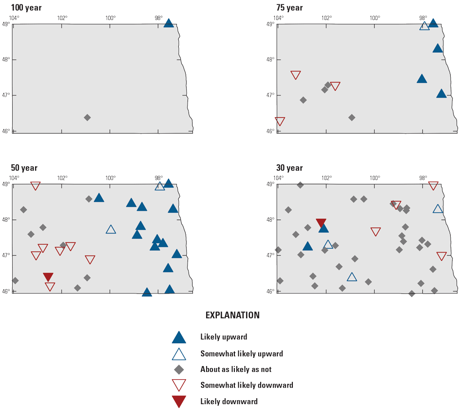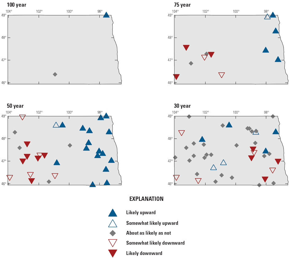 The Third National Climate Assessment (Georgakakos and others, 2014) documented mostly increasing peak flow in the Midwest, with the largest trends in the Red River Basin, whereas west of the 100th meridian, most of the peak-flow trends were downward. The Fifth National Climate Assessment (Knapp and others, 2023) highlights the differences in peak-flow trends in eastern and western North Dakota and indicates that this pattern is consistent in the Northern Great Plains. Observed trends indicate that peak flow has decreased in the west, generally west of the 100th meridian, and increased in the east. With few exceptions, the eastern Dakotas have experienced increasing peak flow, whereas the western Dakotas, Montana, and Wyoming have experienced decreasing peak flow.