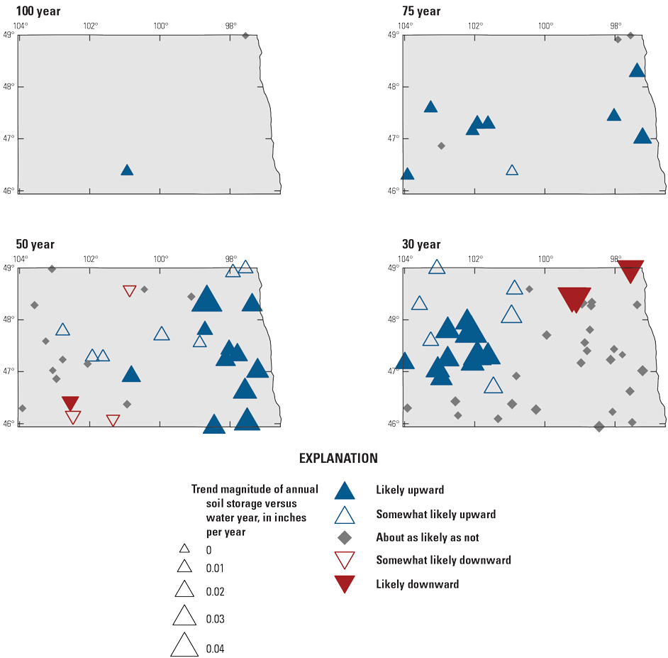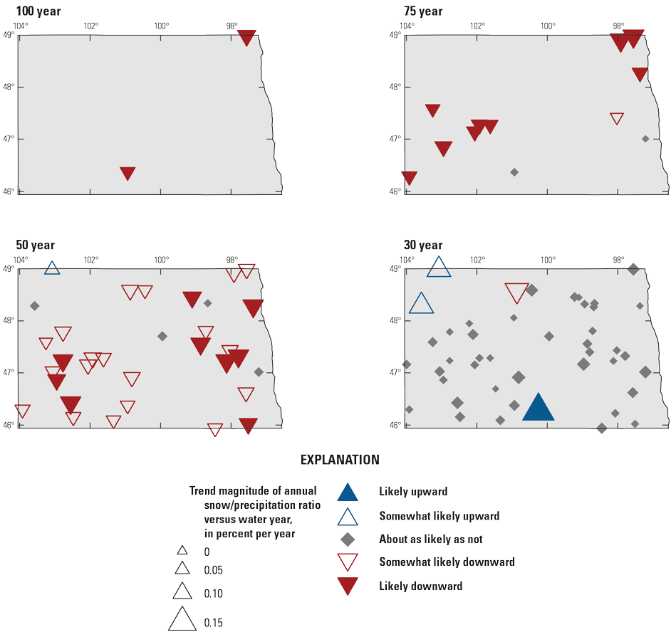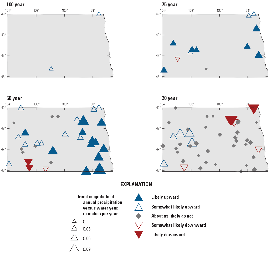 Analysis of temporal changes in streamflow for the 1912–2011 period (Wise and others, 2018) indicated decreases in snowpack and streamflow in the Upper Missouri River Basin, including areas in Montana, North Dakota, and South Dakota. Mallakpour and Villarini (2015) analyzed the 1962–2011 changes in flood characteristics in the central United States and reported an increase in the magnitude and frequency of flooding in eastern North Dakota at the annual scale, along with increases in frequency of heavy rainfall events. At the seasonal scale, the magnitude and frequency of flooding increased in summer and fall in eastern North Dakota, and widespread increases in the frequency of fall heavy rainfall events were observed. Increases in spring flooding were characterized by more increases in frequency than magnitude, and increases in winter flooding were characterized by increases in magnitude (Mallakpour and Villarini, 2015).