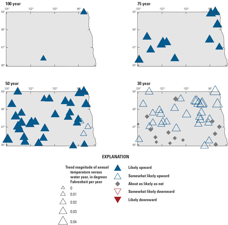 Changes in temperature also exist in the region, but in a manner different from the changes in precipitation. Wang and others (2009) determined that the strongest U.S. surface air temperature warming in 1950–2000 was in the spring over the northwestern United States and the Northern Plains. North Dakota’s warming has been primarily in the winter and spring, with minimal warming in the summer months, a pattern like other States in the Great Plains and Midwest (Reidmiller and others, 2018; Frankson and others, 2022; Marvel and others, 2023). Since 1900, winter temperatures have risen by 4.5 °F per century, whereas summer temperatures have risen by 1.5 °F per century during the same period (Frankson and others, 2022). The period of 2000–20 has been one of the warmest recorded periods for North Dakota, and 2006, 2012, 2015, and 2016 are comparable to the heat of the Dust Bowl era in the 1930s (Frankson and others, 2022).