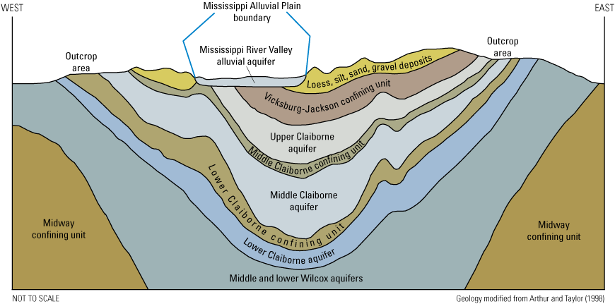 Generalized west-to-east profile of the Mississippi embayment aquifer system (modified from Arthur and Taylor, 1998).