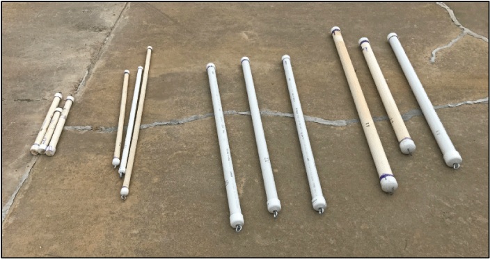 Twelve mechanical polyvinyl chloride slugs of various sizes and volumes were constructed and calibrated for this study (fig. 3). The slugs were constructed of capped, schedule-40 polyvinyl chloride pipes that were filled with gravel, and a steel eye bolt was installed in one end cap of each slug. The slugs were calibrated by repeatedly submerging them in a calibration well with a known diameter. Water levels were measured by using a calibrated electric water-level tape, and the volume of water displaced was calculated. Detailed slug dimensions and calibration information are available in the associated data release (Pugh, 2023).