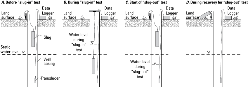 Well diagrams showing a mechanical slug and pressure transducer: A, mechanical slug poised just above the water level before slug-in test, B, mechanical slug submerged below water level for slug-in test, C, mechanical slug removed just above water level for slug-out test, and D, mechanical slug removed from well following slug-out test (from Cunningham and Schalk, 2011).