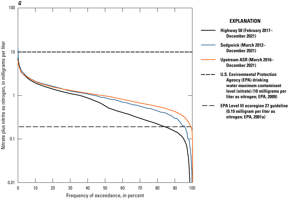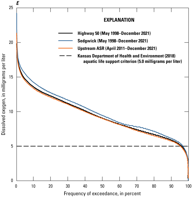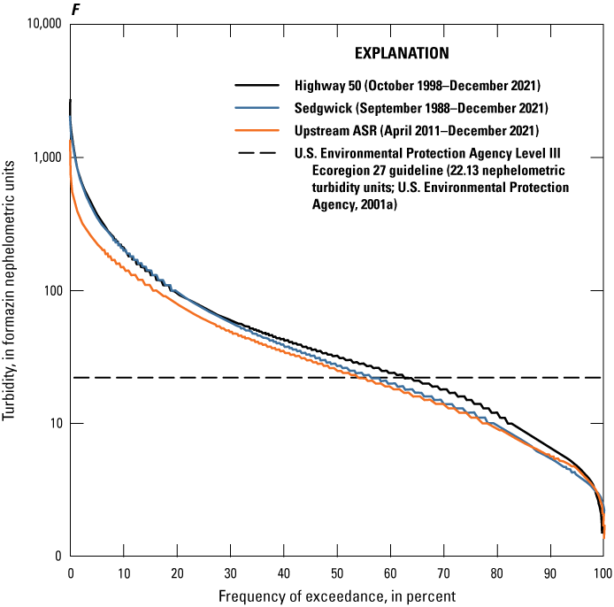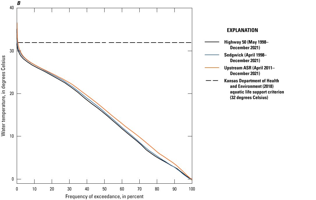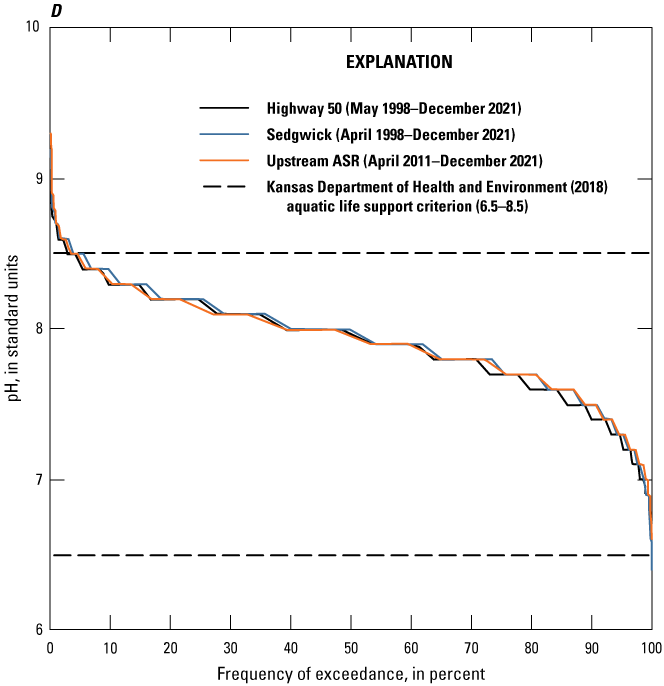 Duration curves were used to summarize continuously measured or select computed Little Arkansas River water-quality data. Duration curves are cumulative distribution functions and were constructed using hourly values to evaluate and compare frequency and magnitude characteristics at the Highway 50, Sedgwick, and Upstream ASR sites during the study period. Duration curves are indicative of the percentage of time that specified conditions were equaled or exceeded, or the frequency of exceedance (Searcy, 1959). The Weibull formula (Weibull, 1939; Helsel and others, 2020) was used for plotting position.
