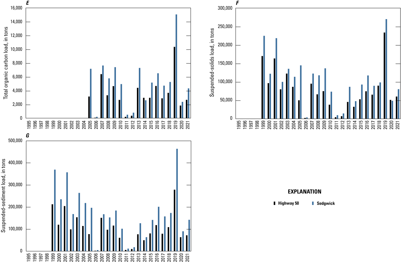 Loads were computed at the Highway 50 and Sedgwick sites for selected water-quality constituents, including those that have TMDLs. Chloride, nitrate plus nitrite, ammonia plus organic nitrogen, total phosphorus, dissolved organic carbon, total organic carbon, suspended solids, suspended-sediment concentration, E. coli bacteria, fecal coliform bacteria, and atrazine loads were computed during 1999 (the first full year of water-quality monitor measurements) through 2021. Water-quality constituent loads, with the exception of indicator bacteria, were calculated in tons per day. E. coli and fecal coliform bacteria were calculated in trillions of colony-forming units per day. Loads were computed by multiplying regression model-computed daily concentrations or densities (in milligrams per liter, micrograms per liter, or colony forming units per 100 milliliters) by daily streamflow (cubic feet per second) and a unit conversion factor of 0.0027 (for constituents measured in concentrations of milligrams per liter), 2.7x10−6 (for constituents measured in concentrations of micrograms per liter), or 2.45x10−5 (for constituents measured in densities of colony forming units per 100 milliliters). Annual loads were computed by summing the daily loads. Annual yields (in pounds or trillions of colony-forming units per square mile) were calculated by dividing the annual loads by the contributing drainage area at the Highway 50 (685 mi2) and Sedgwick (1,165 mi2) sites.