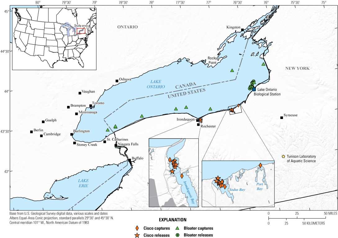 Loss of native fishes from North America’s Lake Ontario (fig. 1) has been caused largely by anthropogenic changes to habitat conditions, harvest, and the biotic environment (for example, invasive species; Mills and others, 2003). Historically, Coregonus artedi (cisco), C. clupeaformis (lake whitefish), C. kiyi (kiyi), C. hoyi (bloater), and other deepwater coregonine species were the primary forage species for predatory fish in Lake Ontario and the basis of large fisheries, with millions of fish harvested annually (Van Oosten, 1930; Eshenroder and others, 2016). All coregonine species—except cisco, lake whitefish, and Prosopium cylindraceum (round whitefish)—were extirpated from Lake Ontario during the past century, and the remaining species are severely depleted (Bronte and others, 2017; Stewart and others, 2017).