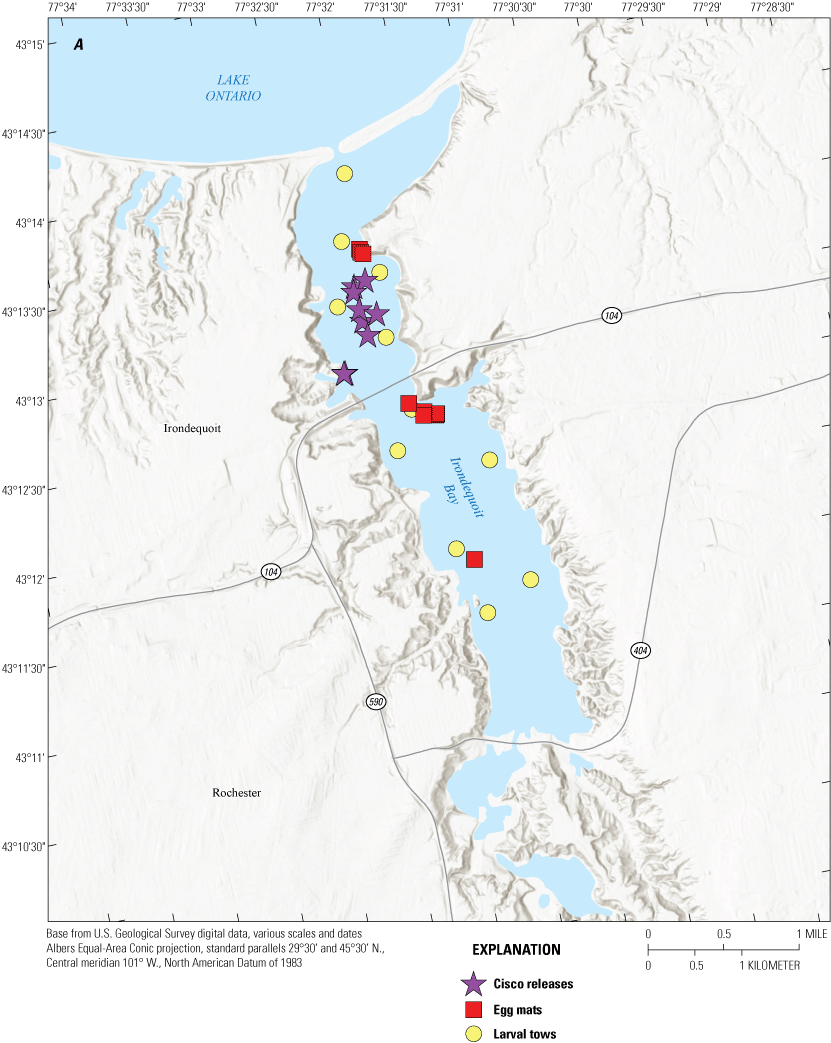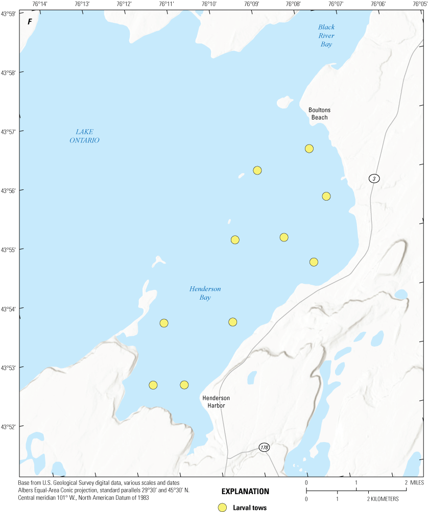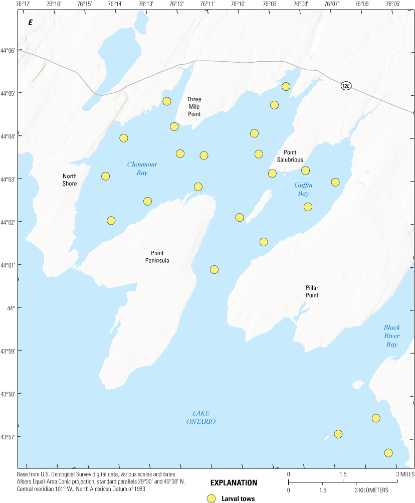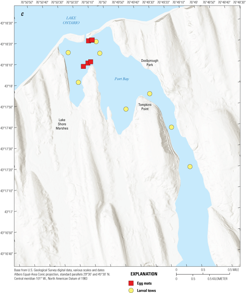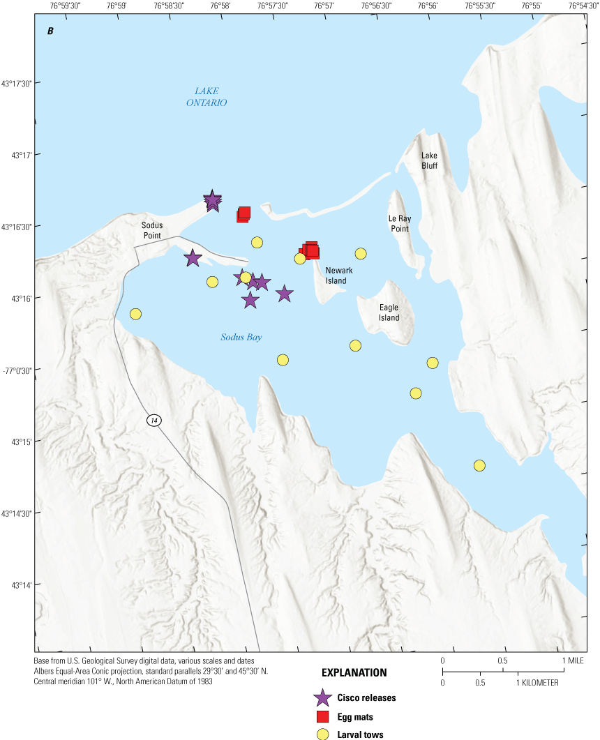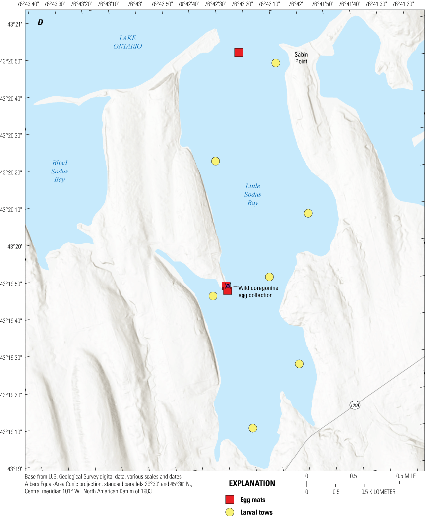 Brown, T.A., Sethi, S.A., Rudstam, L.G., Holden, J.P., Connerton, M.J., Gorsky, D., Karboski, C.T., Chalupnicki, M.A., Sard, N.M., Roseman, E.F., Prindle, S.E., Sanderson, M.J., Evans, T.M., Cooper, A., Reinhart, D.J., Davis, C., and Weidel, B.C., 2022, Contemporary spatial extent and environmental drivers of larval coregonine distributions across Lake Ontario: Journal of Great Lakes Research, v. 48, p. 359–370