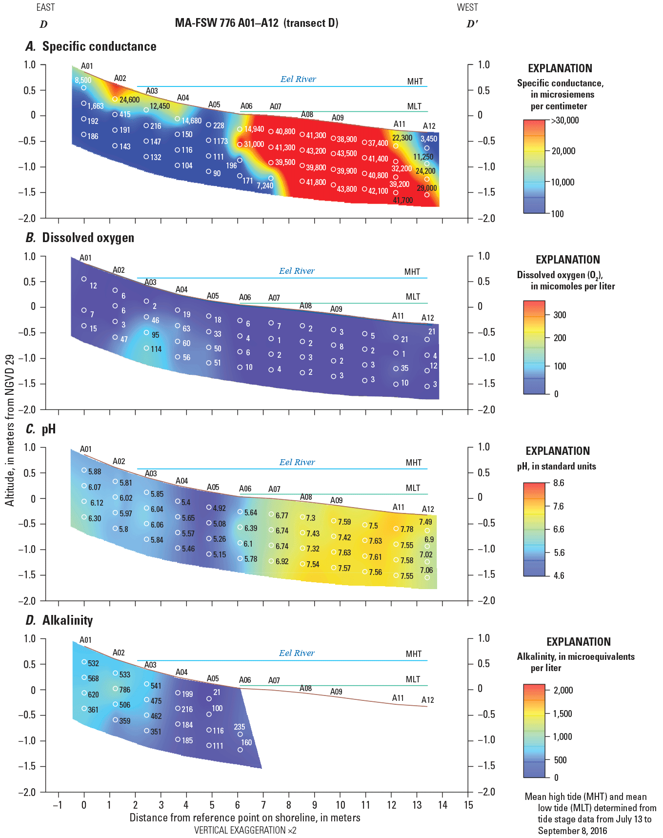 Dissolved oxygen concentrations generally were suboxic in the subtidal zone in transects B–B′ and D–D′ (figs. 8B and 9B). Suboxic is defined here as dissolved oxygen concentrations less than about 0.5 mg/L (<16 µmol/L as O2) (Hinkle and others, 2007). Dissolved oxygen concentrations (as O2) less than 30 µmol/L are favorable for classical denitrification (Spiteri and others, 2008). Dissolved oxygen concentrations in the subtidal zone in transect A–A′ were more variable, ranging from suboxic to 71 µmol/L (fig. 7B). In the intertidal zone in transects A–A′ and D–D′ from 61-cm to 122-cm depths below the sediment surface, dissolved oxygen concentrations generally ranged from 18 to 86 µmol/L. The intertidal zone in transect B–B′ was suboxic (fig. 8B). For the three locations sampled in October 2016 along transect C–C′, dissolved oxygen concentrations were less than 10 µmol/L at 1.8-m depth, 80–270 µmol/L at 3.3-m depth, and 36–126 µmol/L at 4.88-m depth (Huntington and others, 2024). Dissolved oxygen concentrations were similar to those measured at depths less than 2 m in 2013 (Colman and others, 2018) but were about two times higher than what was measured from 3- to 5-m depths in 2013.