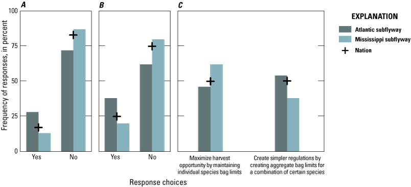 There was clear disagreement between respondents in the Mississippi and Atlantic subflyways when it came to preferences for regulation intentions (table 9; fig. 11C). The Mississippi subflyway respondents showed a clear preference for regulations that maximize harvest opportunity by maintaining individual species regulations (62 percent) relative to the Atlantic subflyway respondents, who preferred simpler aggregate regulations even at the expense of harvest opportunity (54 percent). The subflyway respondents differed in these opinions from the national survey response, which was split equally between each preference (fig. 11C).