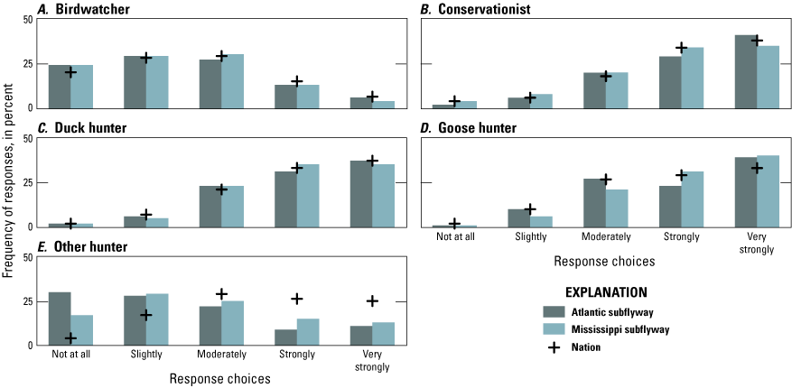 There was strong agreement among subflyway respondents when it came to identifying themselves with waterfowl and wetland-related activities (fig. 12A–E); ~65 percent of all respondents strongly or very strongly identified as duck hunters (fig. 12C). This result was also true for respondents who identified as “conservationists” and as “goose hunters” despite slight differences in the extremes (very low or very high). Few respondents identified as “birdwatchers” or “other hunter” and at least 22 percent of respondents reported that they do not identify with those activities at all. There was a key difference in respondents who identified as “other hunter.” Respondents in both subflyways were less likely to strongly identify as “other hunter” than a respondent in the national survey, and the Atlantic subflyway respondents were least likely to identify as “other hunter” (table 10).