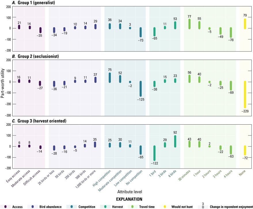 The range of part-worth utility can be evaluated between the lowest level and the highest level for each group. For example, evaluating the enjoyment that members of each group obtain from increasing harvest shows the seclusionist group experiences relatively little change in utility in comparison to the harvest-oriented group who experience a drastic increase in enjoyment for each additional bird harvested (fig. 21B, C). This is an important finding given that levels of enjoyment were not strongly positive or negative among any of the groups for two related attributes—bird abundance and access. This finding would imply that these attributes are less important than others attributes in the DCE because they contribute little to overall enjoyment for respondents.
