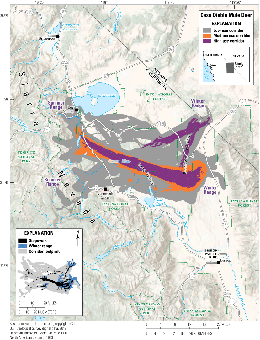 Casa Diablo mule deer are largely traditional migrants and use a wide area primarily spread across public lands. The herd’s winter range extends between the Benton Range and eastern Inyo National Forest. Snowfall can be extreme in the Sierra Nevada and exceed 800 inches (in.; 20.3 meters [m]) in heavy-snow winters, during which deer migrate to areas less than (<) 6,000 ft (1,829 m) in elevation to escape deep snow. In spring, individuals move to the west using a wide range of routes; however, a concentrated migration corridor passes through Long Valley, California (in Mono County), across U.S. Highways 395 and 120, and into the high mountains of the Sierra Nevada (fig. 4). Summer range habitat extends across both sides of U.S. Highway 395. The herd remains to the east and to the south of the Yosemite National Park boundary, typically summering at elevations from 8,000 to 11,000 ft (2,438 to 3,353 m). The primary causes of mortality include Puma concolor (mountain lion) predation, followed by vehicle collisions, most of which are on U.S. Highway 395 during fall and spring migrations. In 2019, the population size of the Casa Diablo herd was estimated at 2,460 (range of 2,037–3,107) mule deer.