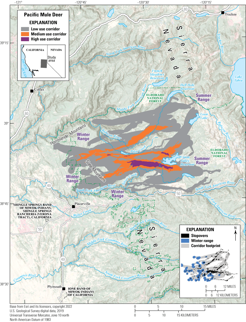 The Pacific mule deer herd inhabits 353 square miles (mi2; 914 square kilometers [km2]) of public and private lands in Placer and El Dorado Counties in California (Hinz, 1981), including the Eldorado National Forest and private lands owned by Sierra Pacific Industries and Sacramento Municipal Utility District. During the fall migration, Pacific mule deer move approximately 19 mi (30 km) to the foothills of the western Sierra Nevada, using stopovers while migrating to their winter range (fig. 5). U.S. Highway 50 and the Middle Fork American River bound the herd’s migration routes on the south and the north, respectively. During winter, the migratory part of the population intersperses with resident deer at lower elevations (2,296–2,953 ft [700–900 m]).
