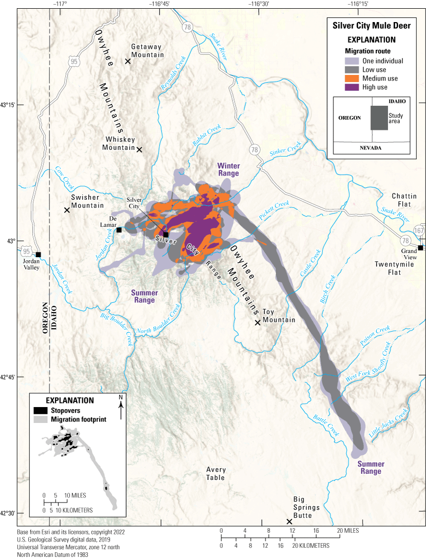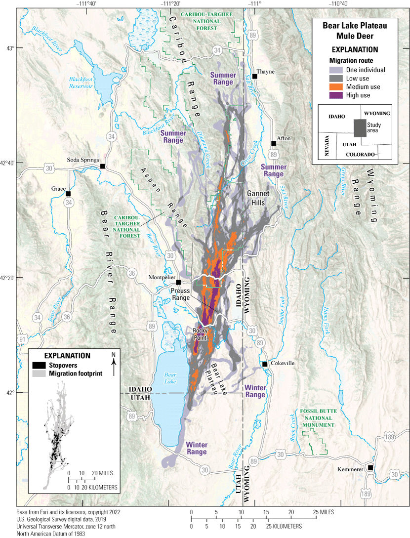 Throughout the Western United States, ungulates commonly migrate to track spatially and temporally variable resources or environmental conditions, such as optimal forage (Merkle and others, 2016; Aikens and others, 2020) or variability in regional winter conditions (Kauffman and others, 2021). Migrations have evolved across generations in ungulates (Jesmer and others, 2018; Lowrey and others, 2020) and are vital to sustaining healthy herds throughout the region. As global positioning system (GPS) technology continues to advance our understanding of ungulate migrations, biologists have also documented an expanding number of threats. The Western United States underwent widespread human development in the late 1900s (1970–99; Gude and others, 2006), which was further heightened during the 2000s and the Coronavirus Disease 2019 pandemic (U.S. Census Bureau, 2022; Rawlings, 2023). The expanding human footprint of roads, fences, housing, energy infrastructure, and increasing traffic volumes result in direct habitat loss, reduced habitat availability, and an increasing number of barriers across the landscapes that ungulates traverse during their migrations and within their seasonal ranges. Such activities can negatively affect wildlife, including ungulates (Sawyer and others, 2009; Aikens and others, 2022; Eacker and others, 2023) and can result in population declines. Documenting and describing migrations across the Western United States provides decisionmakers with information and tools to better mitigate the effects of existing or proposed development through targeted conservation, policy, and management measures. Decisions regarding wildlife that are implemented in the absence of mapped migrations may not be as effective as when relevant information and tools describing existing migrations are readily available and incorporated into the decision-making process.