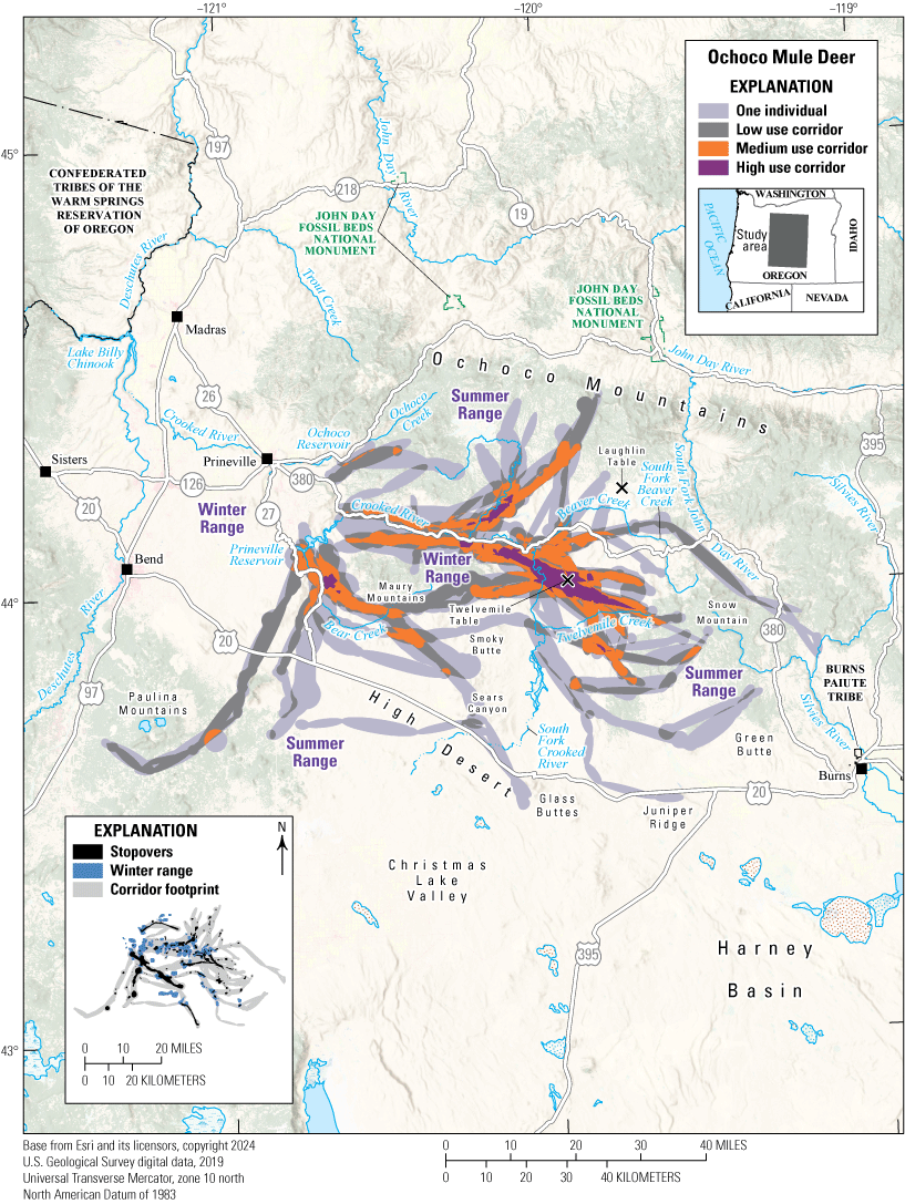 Map showing migration corridors, stopovers, and winter ranges of the Pacific mule deer herd.