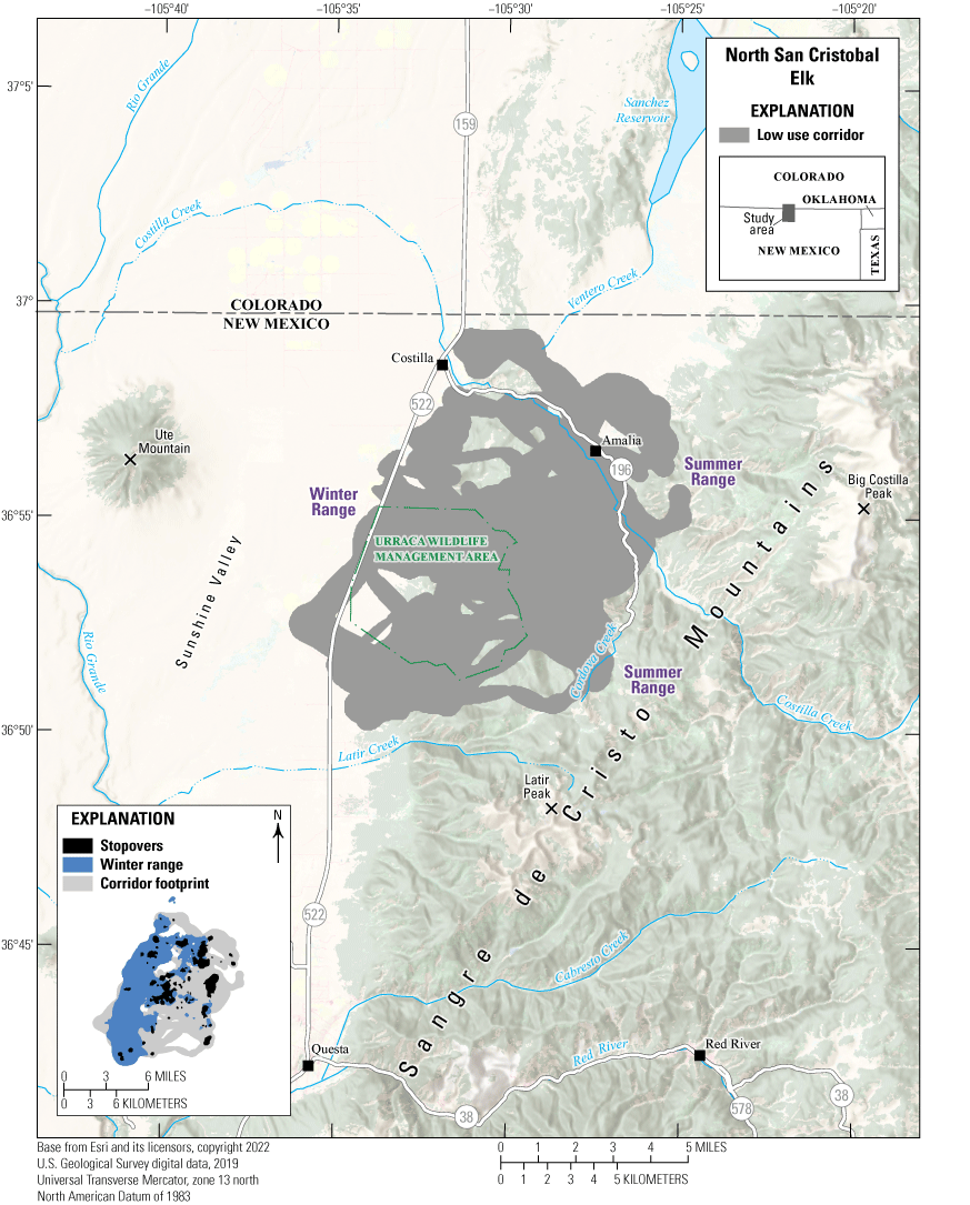 The Rosa Mule Deer herd, previously mapped in Kauffman and others (2022a), migrates an average of 45 mi (73 km) from the herd’s winter range in northwest New Mexico, crossing the Southern Ute Indian Tribe of the Southern Ute Reservation, Colorado, and Jicarilla Apache Nation, New Mexico, lands during their 3-week-long migration, before settling on summer ranges in the San Juan Mountains in Colorado (fig. 3B). Analysis of the GPS data collected between 2011 and 2018 identified four high use corridors that radiate from a shared winter range to multiple summer ranges. These data revealed that mule deer migrating along exterior high use corridors—which researchers suspect experienced different conditions than those conditions on the interior corridors—had a nearly three times higher mortality risk than mule deer using interior corridors (Sawyer and others, 2019). The data also identified several specific areas where mule deer migrated across U.S. Highway 84, to the south of Pagosa Springs, Colorado (Sawyer, 2018); these areas have been used to inform highway crossings to minimize WVC (Kauffman and others, 2022c).