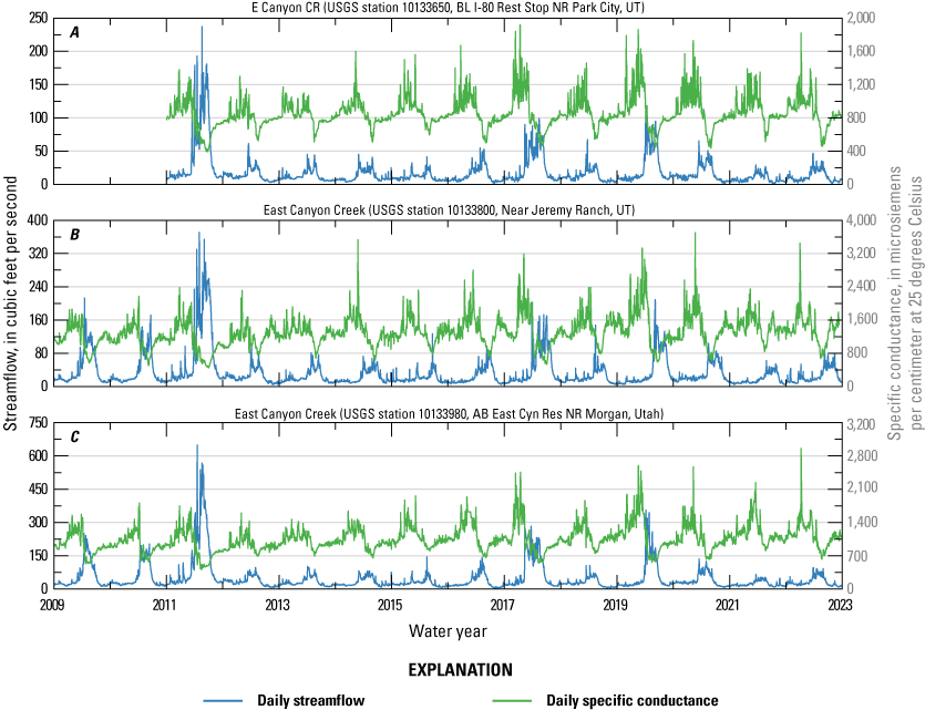 Daily streamflow (blue) and specific conductance (green) records for U.S. Geological Survey (USGS) streamgages (U.S. Geological Survey, 2024) at A, E Canyon CR BL I-80 Rest Stop NR Park City, UT (10133650); B, East Canyon Creek Near Jeremy Ranch, UT (10133800); and C, East Canyon Creek AB East Cyn Res NR Morgan, Utah (10133980). These streamgages are used to estimate baseflow on East Canyon Creek. A water year is the 12-month period from October 1 through September 30 of the following year and is designated by the calendar year in which it ends.