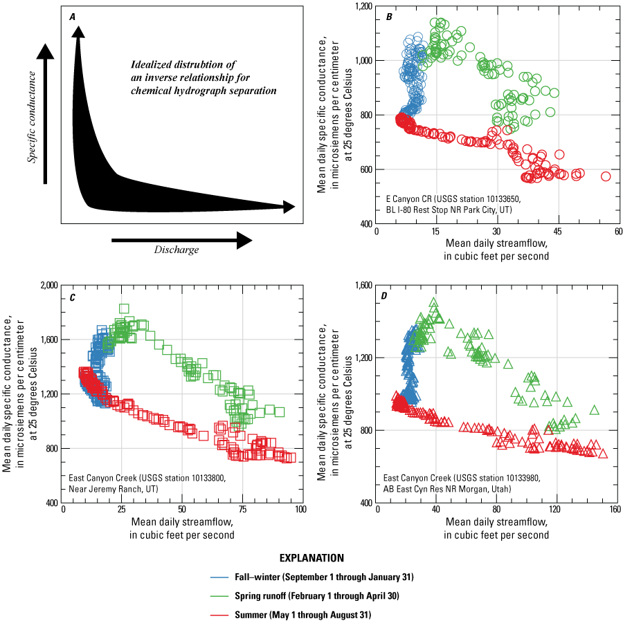 Relations between mean daily specific conductance (SC) and discharge (Q). A, The conductivity mass balance approach is best applied in rivers and streams that have an inverse relation between Q and SC, as indicated in this idealized graphic (Miller and others, 2014; Rumsey and others, 2015). The mean daily relations between Q and SC are shown for U.S. Geological Survey (USGS) streamgages B, 10133650 (E Canyon CR BL I-80 Rest Stop NR Park City, UT); C, 10133800 (East Canyon Creek Near Jeremy Ranch, UT); and D, 10133980 (East Canyon Creek AB East Cyn Res NR Morgan, Utah). During runoff (February–April), a distinct trend separate from the summer, fall, and winter is present at all streamgages (U.S. Geological Survey, 2024).