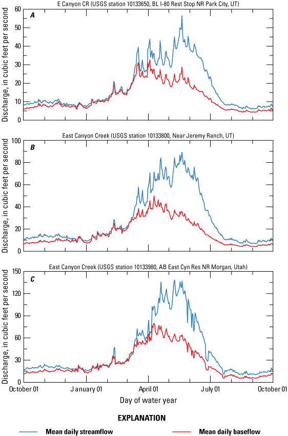 Mean daily streamflow (blue) and estimated baseflow (red) for U.S. Geological Survey (USGS) streamgages (U.S. Geological Survey, 2024) at A, E Canyon CR BL I-80 Rest Stop NR Park City, UT (10133650); B, East Canyon Creek Near Jeremy Ranch, UT (10133800); and C, East Canyon Creek AB East Cyn Res NR Morgan, Utah (10133980). These data represent the mean for all available daily values on each day of the water year for the period of record. A water year is the 12-month period from October 1 through September 30 of the following year and is designated by the calendar year in which it ends.