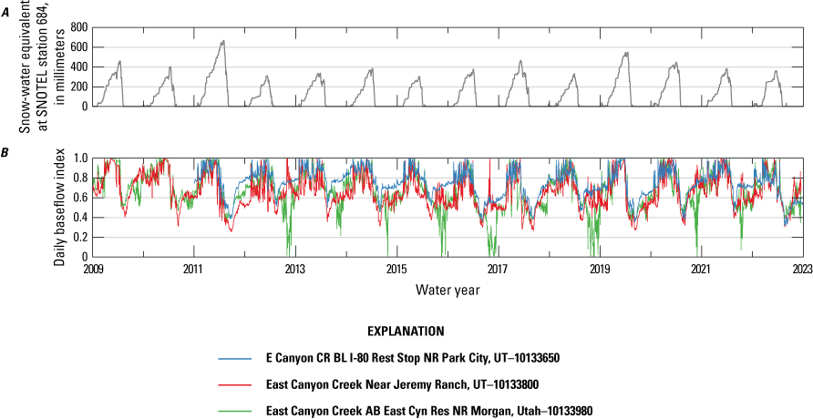 Time series of A, snow-water equivalent at the Parleys Summit snow telemetry (SNOTEL) station (684; U.S. Department of Agriculture, National Water and Climate Center, 2025) and B, daily baseflow index (BFI) for U.S. Geological Survey streamgages (U.S. Geological Survey, 2024) at E Canyon CR BL I-80 Rest Stop NR Park City, UT (10133650), East Canyon Creek Near Jeremy Ranch, UT (10133800), and East Canyon Creek AB East Cyn Res NR Morgan, Utah (10133980). Baseflow may be overestimated on some days and exceed a ratio of 1.0 of baseflow to streamflow; in these instances, the BFI is capped at 1.0 for visual representation. A water year is a one-year period from October 1 through September 30 of the following year and is named for the year in which the period ends.