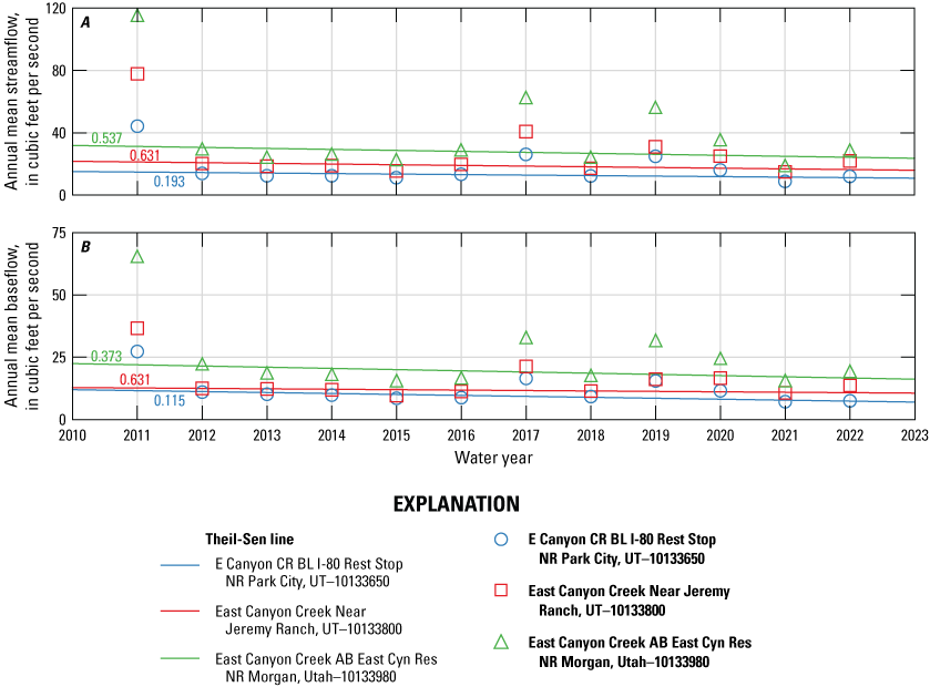 Annual time series for water years 2011–22 for A, annual mean streamflow and B, annual mean baseflow for U.S. Geological Survey streamgages (U.S. Geological Survey, 2024) at E Canyon CR BL I-80 Rest Stop NR Park City, UT (10133650), East Canyon Creek Near Jeremy Ranch, UT (10133800), and East Canyon Creek AB East Cyn Res NR Morgan, Utah (10133980) with the Theil–Sen line for each respective dataset. Numbers along the Theil–Sen line are p-values from the Mann–Kendall trend test that have been corrected for autocorrelation; the colors of these numbers correspond with their respective streamgage. A water year is a one-year period from October 1 through September 30 of the following year and is named for the year in which the period ends.
