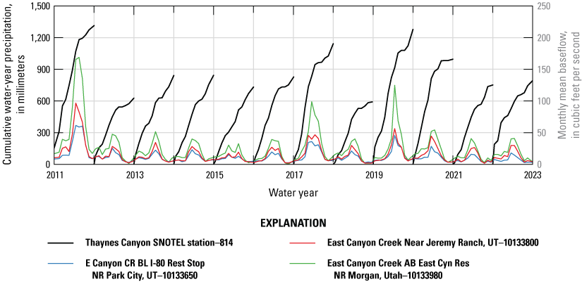 Baseflow was estimated at three USGS streamgages (10133650, 10133800, and 10133980) on East Canyon Creek. Daily baseflow (fig. 5), mean daily baseflow (fig. 6), and annual and seasonal BFI (table 3) were calculated by conductivity mass balance hydrograph separation and associated calculations at each streamgage. The annual streamflow and baseflow volume delivered to East Canyon Reservoir at USGS streamgage 10133980 ranged from approximately 16,800 to 92,000 and 11,000 to 60,000 acre-feet (acre-ft), respectively. These values were based on the annual mean discharge at the streamgage according to annual statistics for the period of record (U.S. Geological Survey, 2024). Though streamflow and baseflow proportionally increased at streamgages downstream as East Canyon Creek gains from its tributaries, the contribution from baseflow to streamflow decreased by about 10 percent (table 3). The streamflow and baseflow volumes increased by a factor of approximately 3 from the most upstream USGS streamgage (10133650) to the most downstream USGS streamgage (10133980).