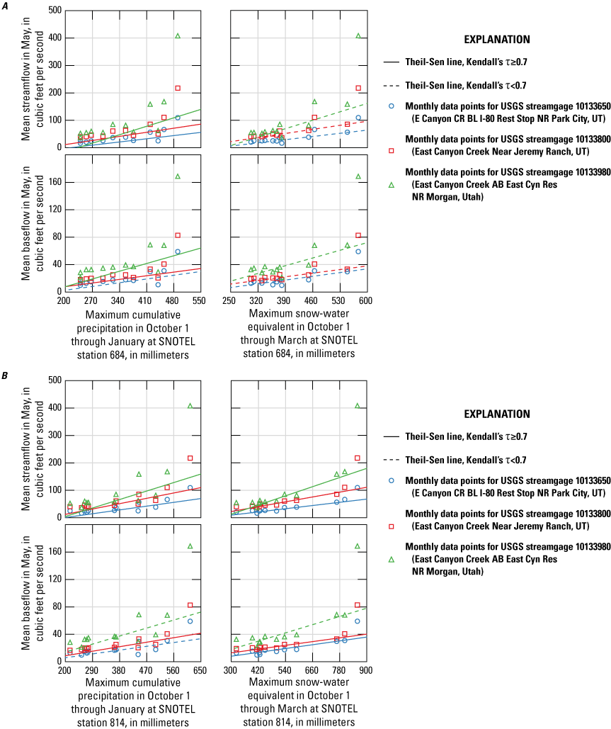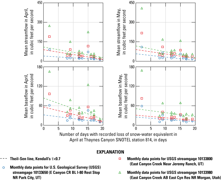 Changes in snowpack, precipitation, and temperature at SNOTEL stations and in streamflow and baseflow at streamgages were assessed for trends independently and with respect to one another. Data from two SNOTEL stations within the East Canyon Creek watershed at Parleys Summit (station 684) and Thaynes Canyon (station 814) were considered, and only streamgages on East Canyon Creek that had estimated baseflow were included in the trend tests (USGS streamgages 10133650, 10133800, and 10133980).